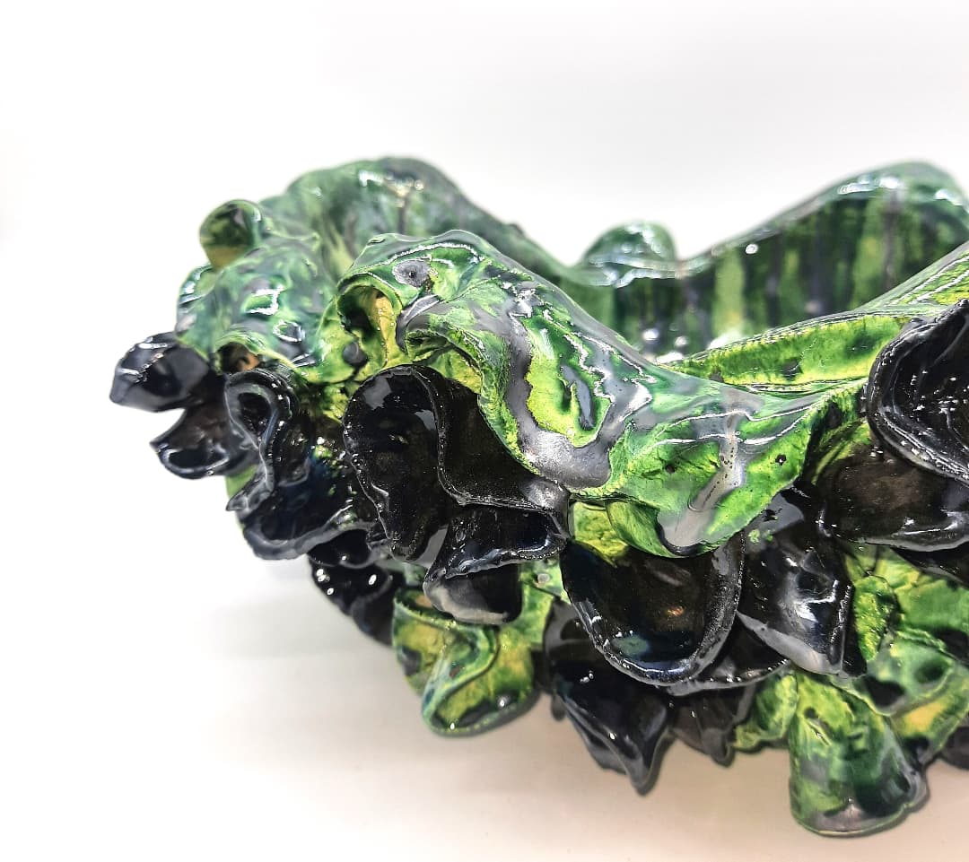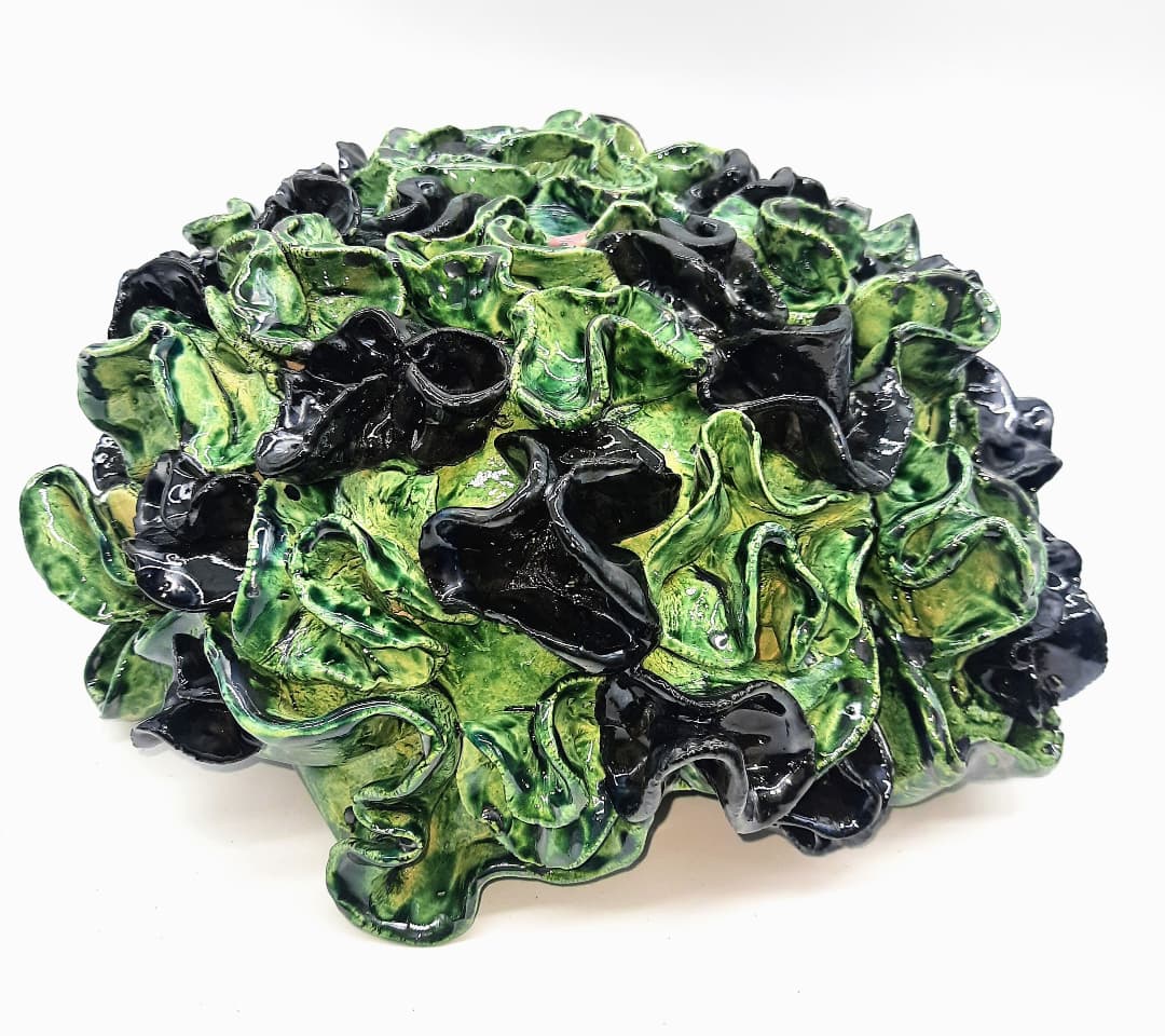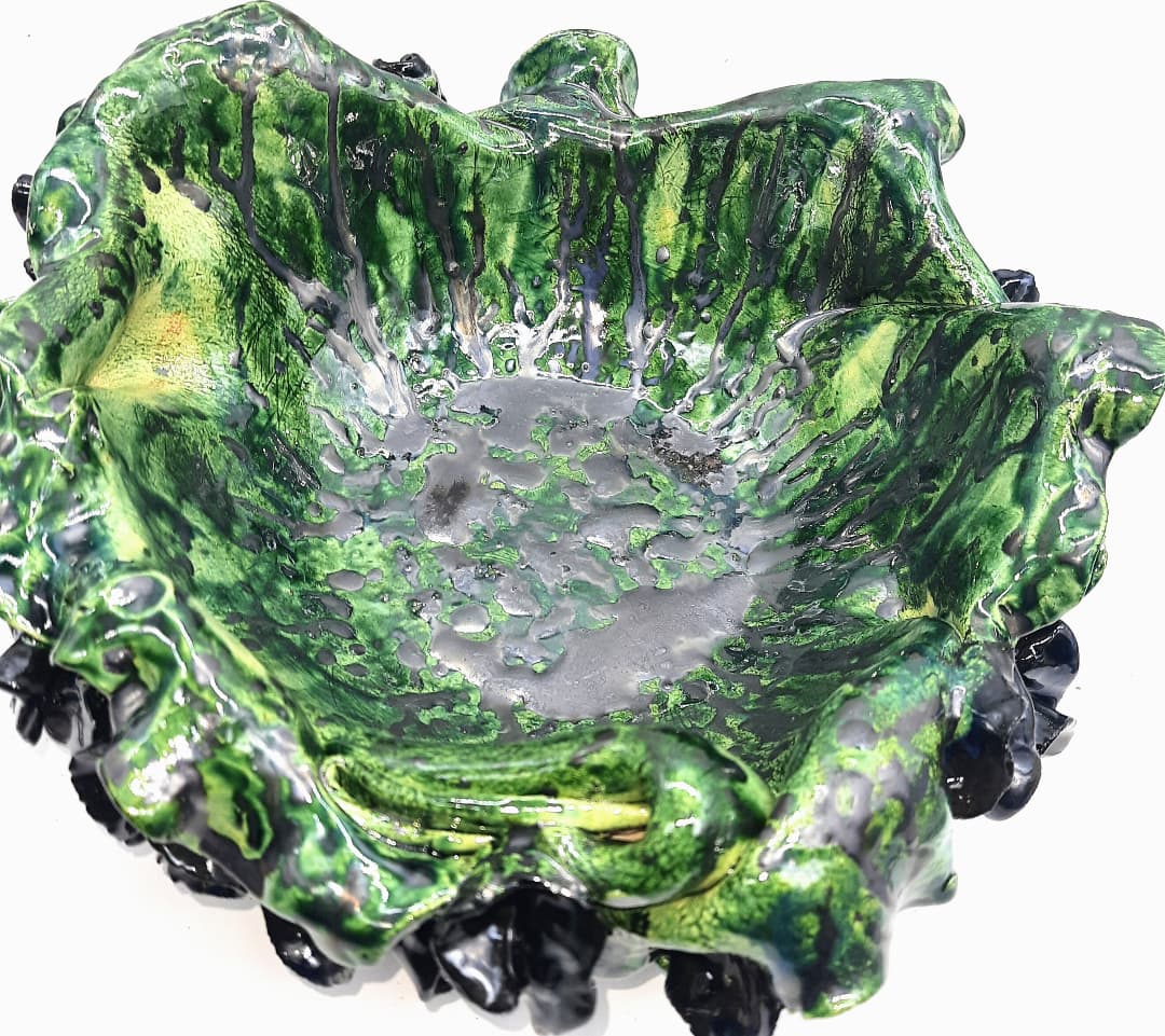 Duża ceramiczna misa ozdobna, szkliwiona tlenkiem miedzi i opiłkami miedzianymi. Wykonana z dwóch rodzajów glin czarnej i jasnej. Technika wypału piec elektryczny. Wymiary średnica 29 cm wysokość 12 cm