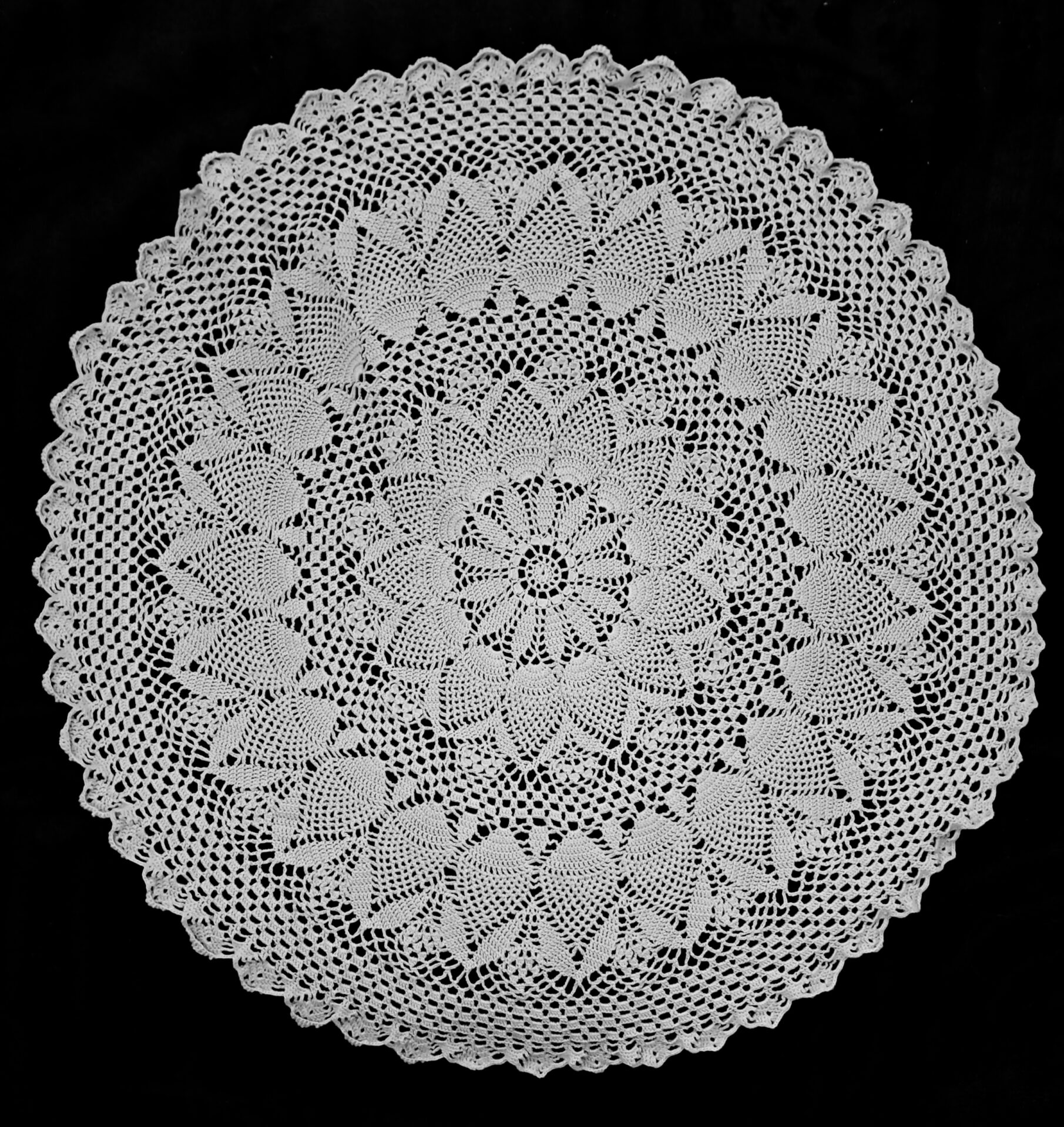 - Ręcznie robiona na szydełku serweta. Praca ma misterny urozmaicony wzór, zawiera elementy dekoracyjne takie jak promienie, wachlarze, ananasy, pęczki czy szachownica. Serweta wykonana jest jasno szarym matowym bawełnianym kordonkiem, prezentuje się bardzo elegancko i efektownie.