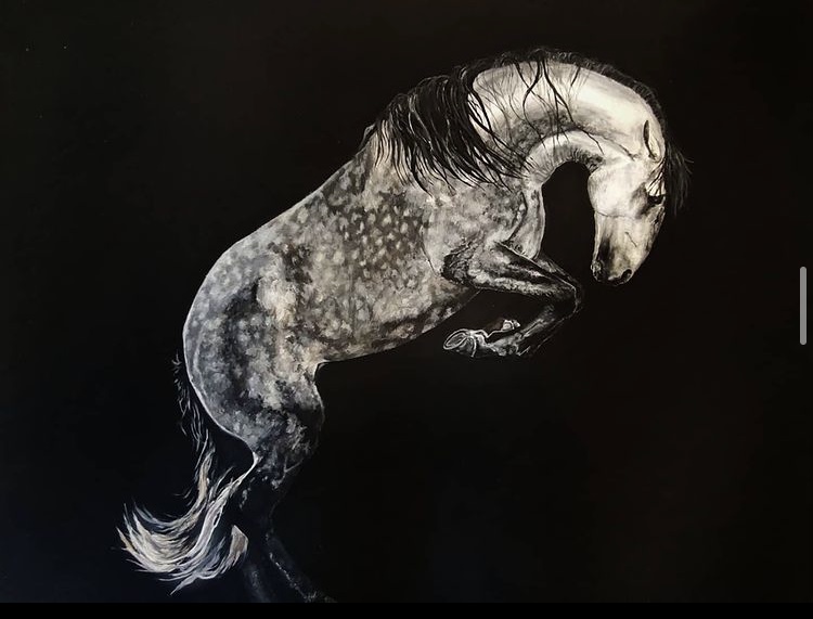 Namalowany farbami akrylowymi, zabezpieczony werniksem. Robi niesamowite, dynamiczne wrażenie.