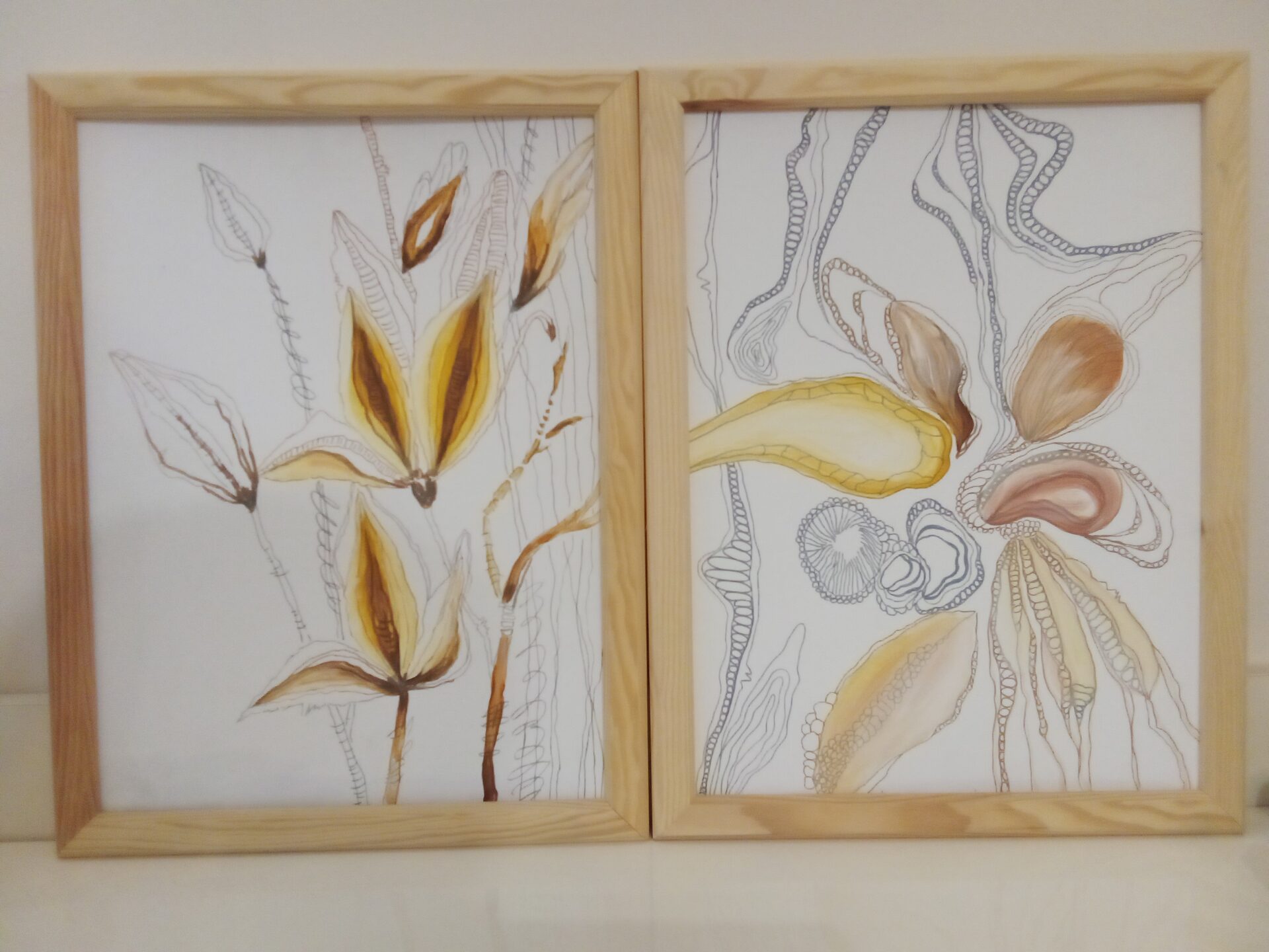 Dyptyk w stylu neurografiki. Malowany farbami akrylowymi na płytach malarskich. Oprawiony w drewnianą, naturalną ramę. Łączne wymiary: 40 x 60 cm.