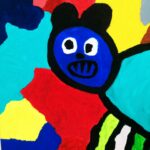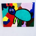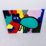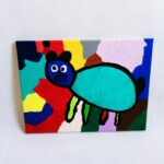 Obraz przedstawia wyobraźnię mojego 5 letniego synka, niedźwiadka na kolorowym tle.