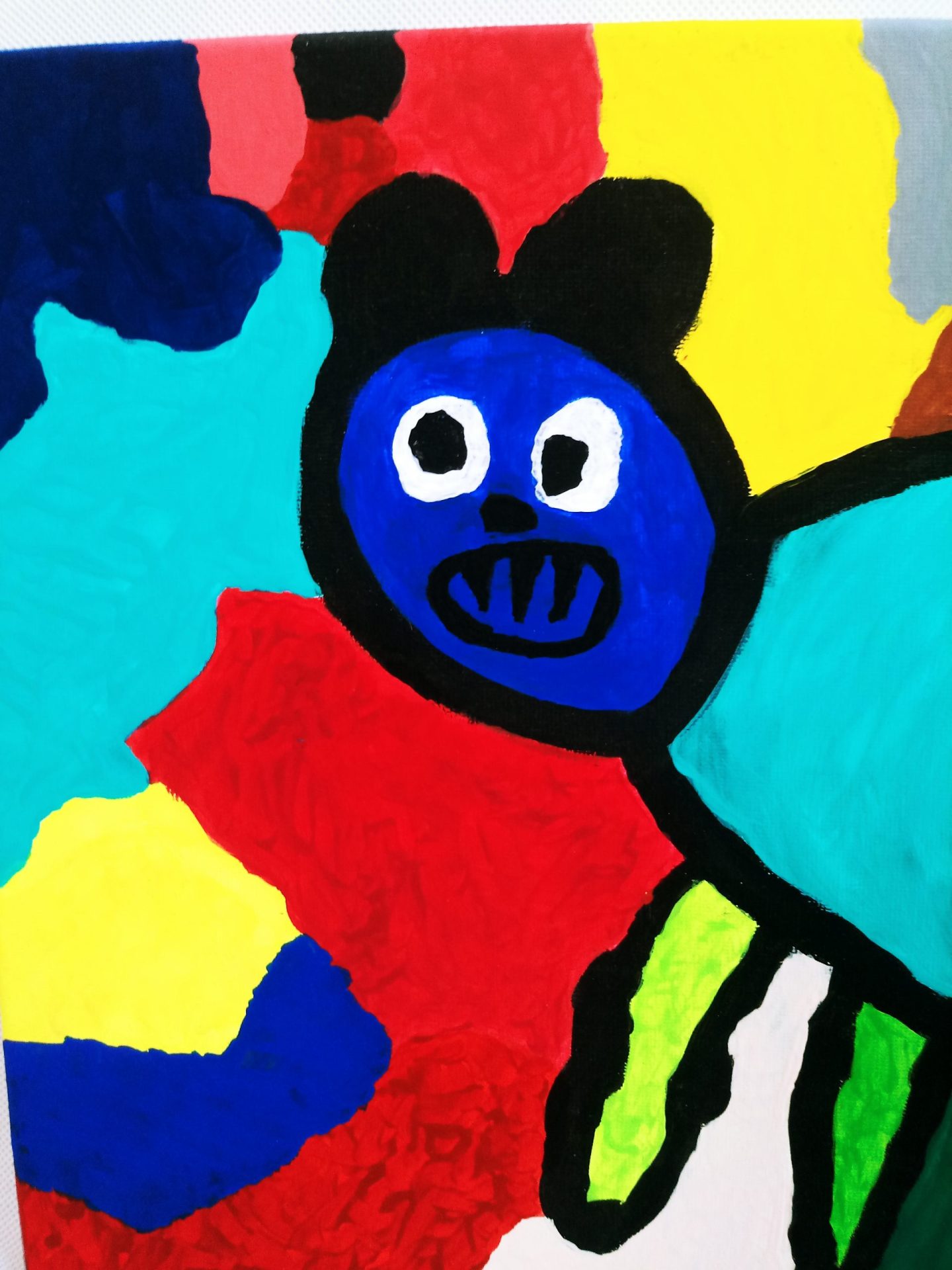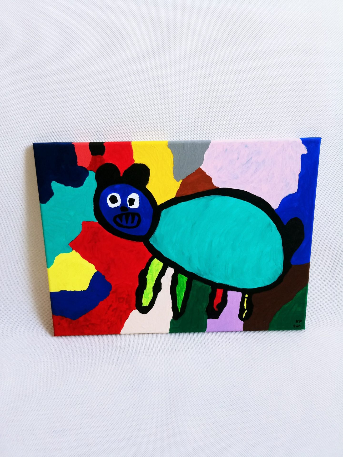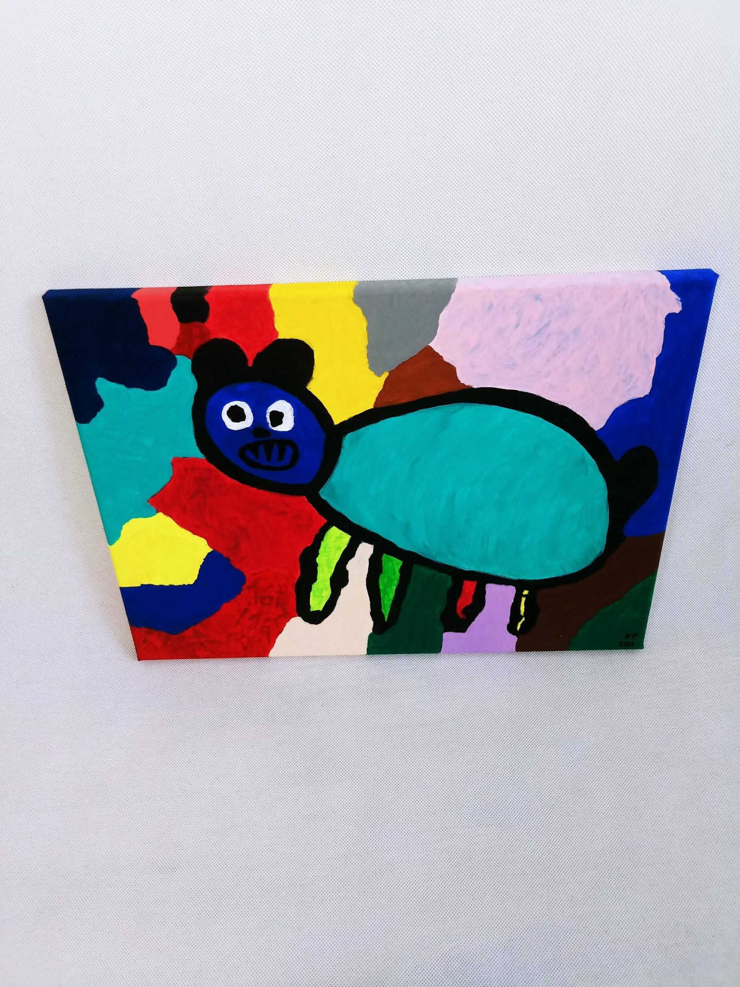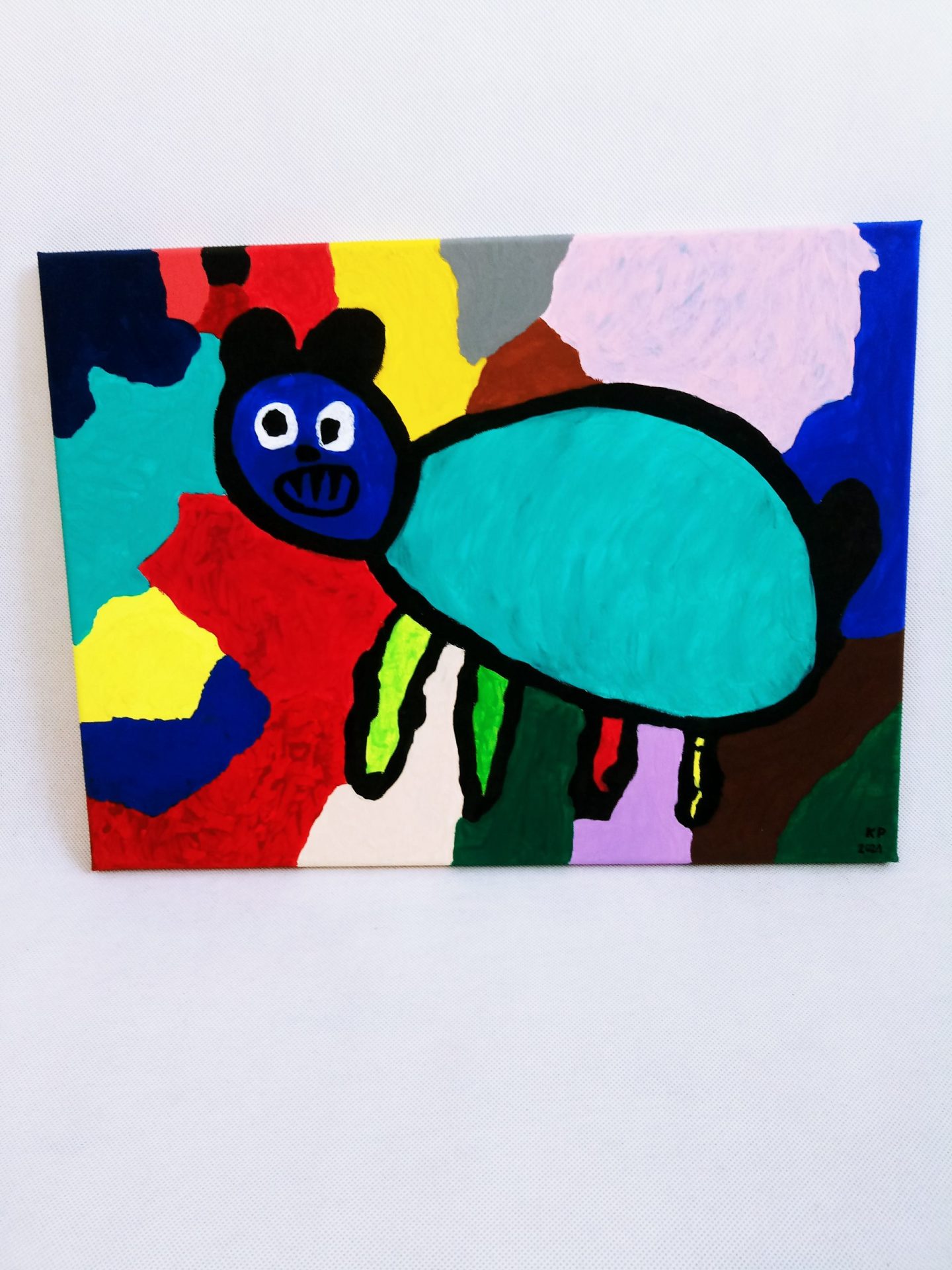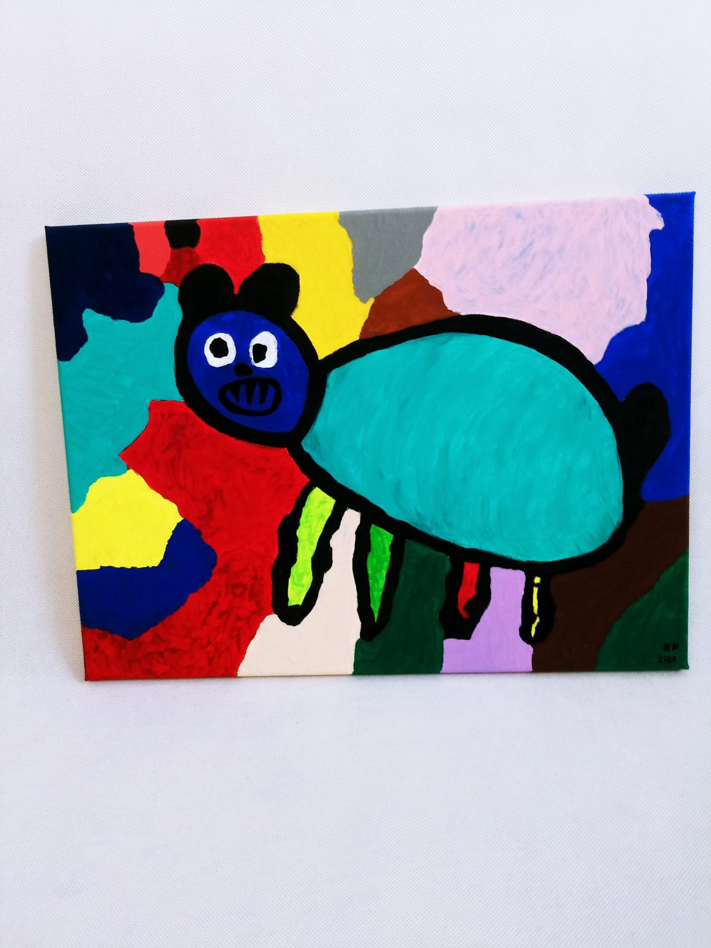 Obraz przedstawia wyobraźnię mojego 5 letniego synka, niedźwiadka na kolorowym tle.