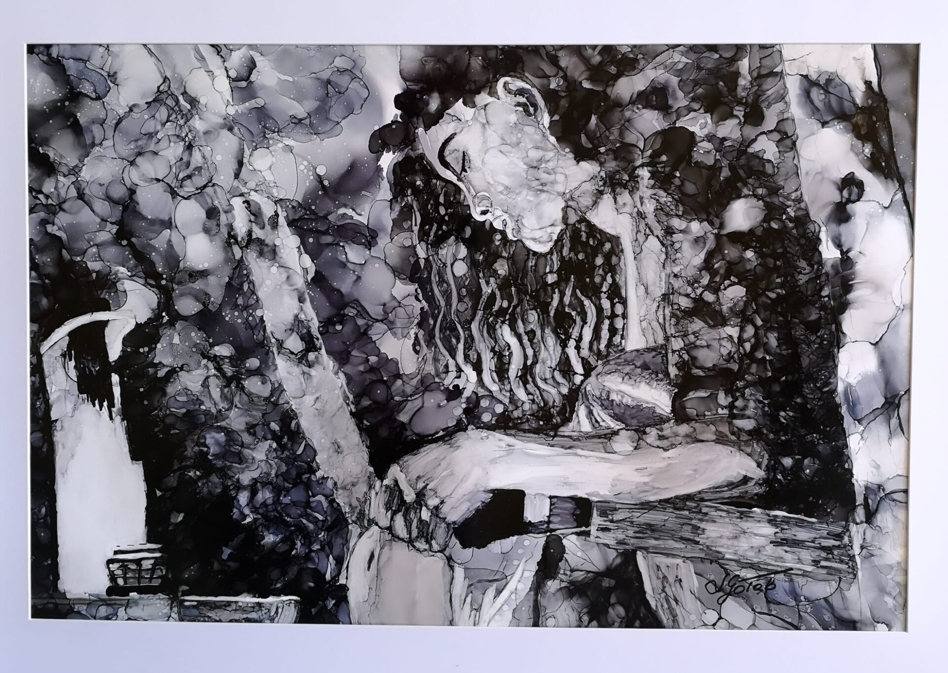 Obraz wykonany techniką tuszy alkoholowych, które dają taki niesamowity efekt.