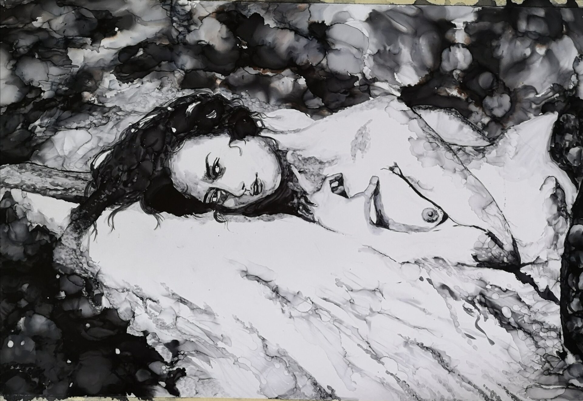 To drugi obraz z cyklu czarno białym. Namalowany tuszami alkoholowymi.