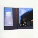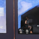 Obraz sztalugowy olejny wykonany na płótnie. Powstał na podstawie autorskiej fotografii z 2022 r., wykonanej na warszawskim Powiślu w pejzażu miejskim. Przeszklone biuro staje się przestrzenią publiczną, pomimo kameralnego charakteru sceny. Lustro szyby odbija pełne przestrzeni błękitne niebo, w cieniu zabudowań widocznych na marginesie, pojawia się scena z wnętrza biura. Dziewczyna siedzi przy biurku, w otoczeniu segregatorów, widać wyraźnie, że jest zajęta pracą. Sądząc po ilości dokumentów wokół niej, jest nad czym pracować. Natężenie światła, kontrast między cieniem panującym wewnątrz i blaskiem nieba odbijającego się na tafli szyby sugerują nadchodzący zmierzch dnia. Obraz w konwencji malarstwa rodzajowego tu i teraz. Scena zaobserwowana w rzeczywiści, stała się pretekstem do kompozycji malarskiej, dokumentującej życie we współczesnym mieście.