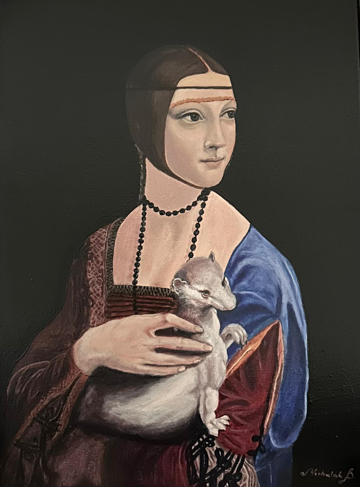 Obraz pt. „Dziewczyna z gronostajem” inspirowany twórczością Leonardo da Vinci, namalowany w 2023r, wymiary 30x40cm, akryl na płótnie, pokryty werniksem. Polecam serdecznie.