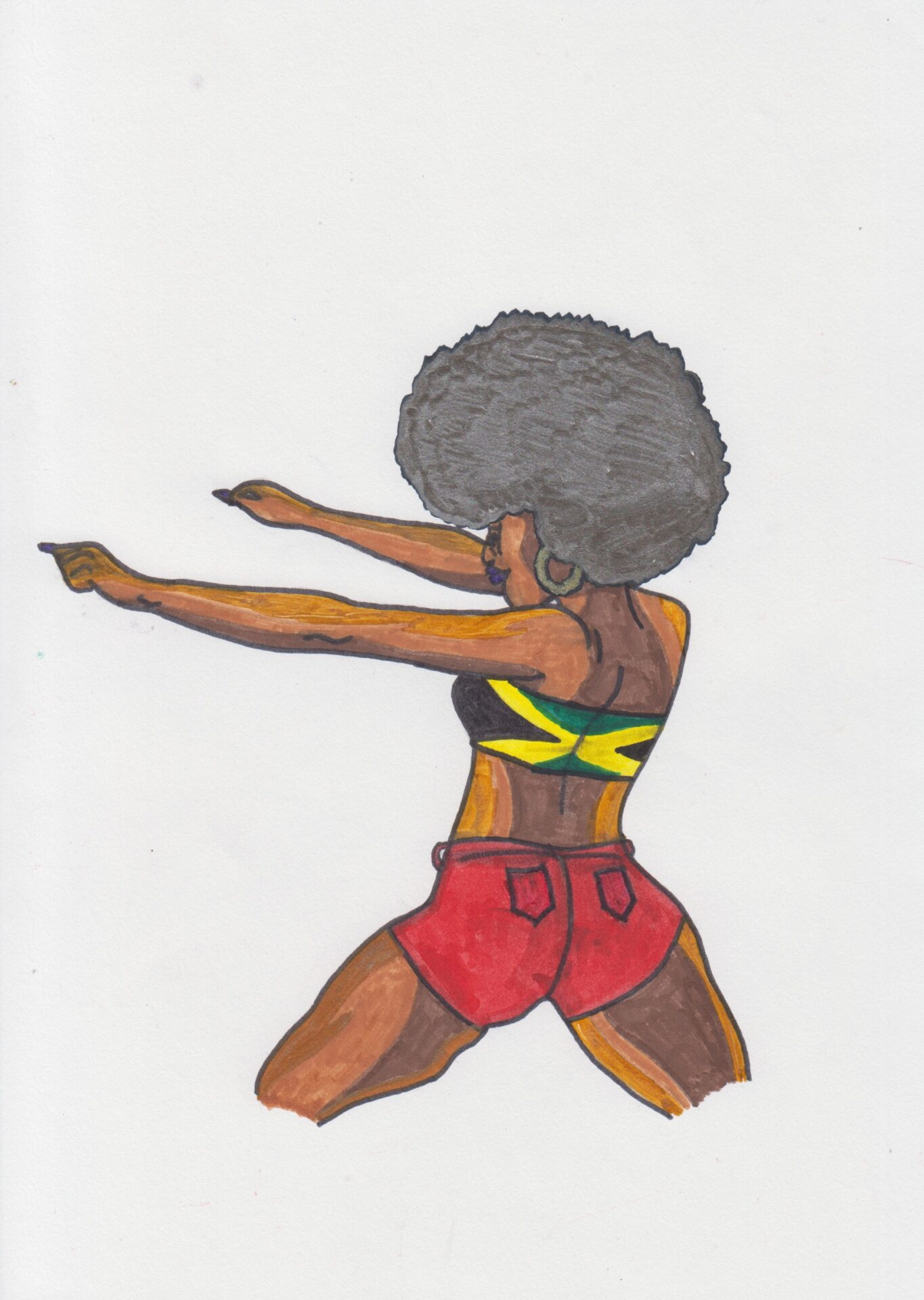 Rysunek a4 namalowany metalicznymi mazakami. Przedstawia tancerkę dancehallu ( najbardziej popularnego tańca na Jamajce ).