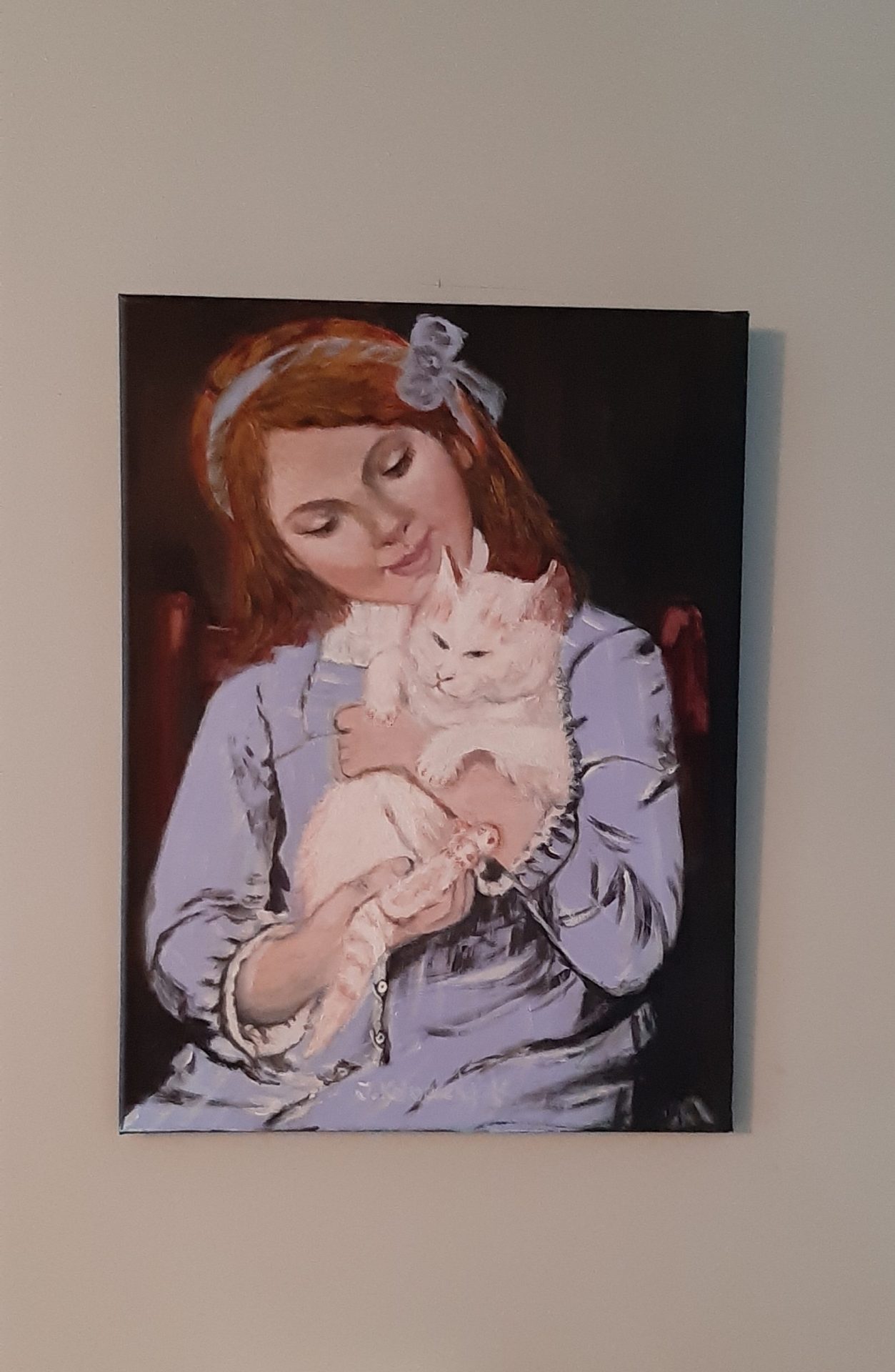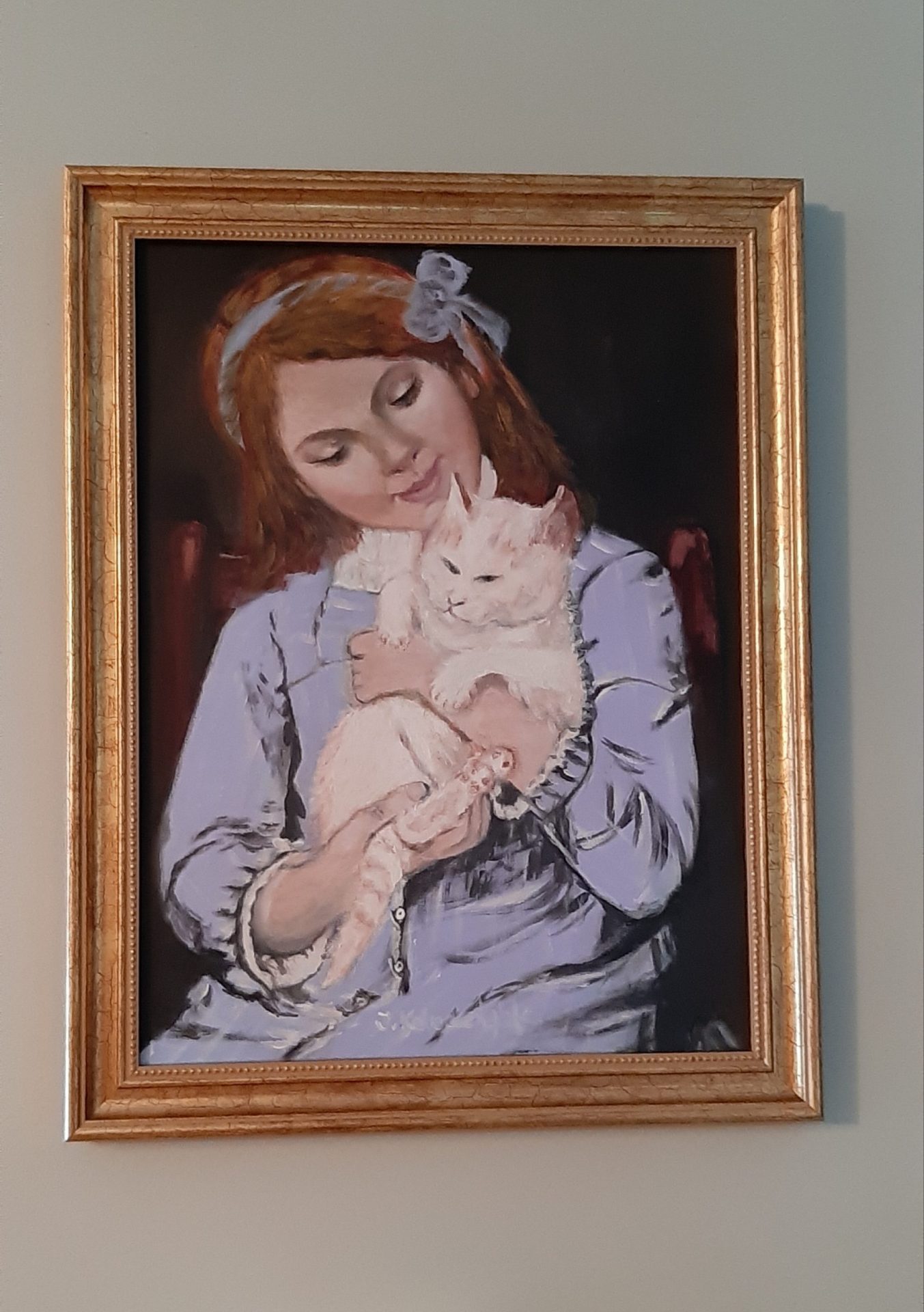 Przedstawia dziewczynkę z ulubionym kotkiem.