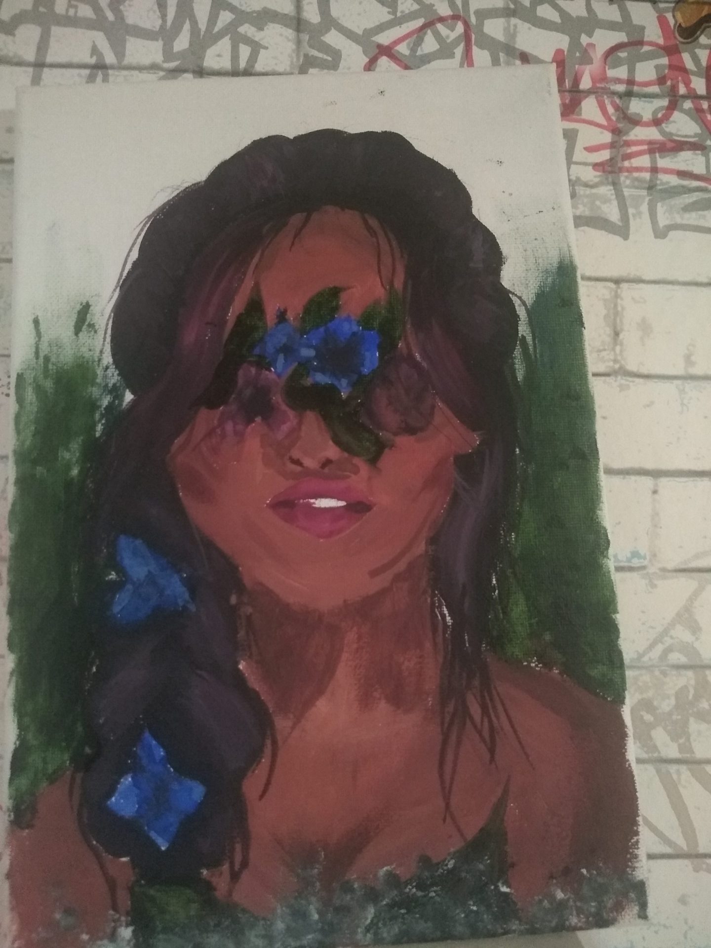 Obraz przedstawia dziewczynę ciemniejszej karnacji oczy ma zakryte kwitami które też są wplecione w warkocz