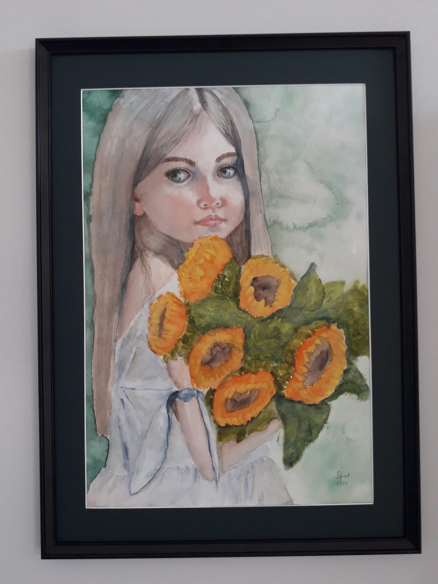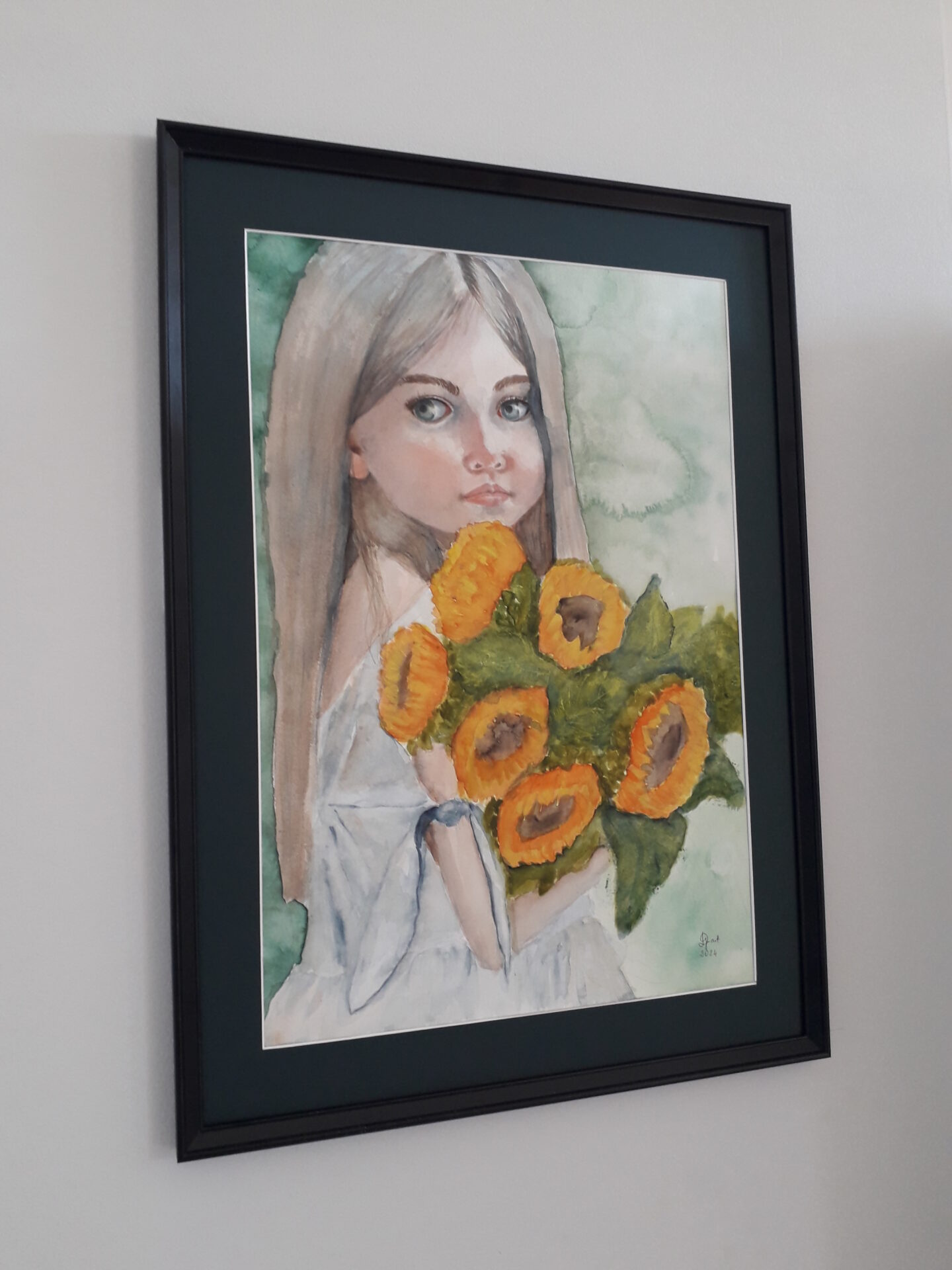Dziewczynka z bukietem słoneczników. Akwarela na papierze 100% bawełny, gramatura 300 g. Obraz w formacie A2 (42×60 cm). Sprzedaję bez ramy i passparout. Wysyłka kurierem (przedpłata) 20 zł. Zapraszam do zakupu.