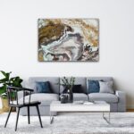 Wykonany metodą pouringu. Farby akrylowe. Wysokiej jakości podobrazie bawełnianym o gramaturze 335 g/m2, wykonane z krosien sosnowych.