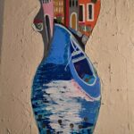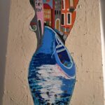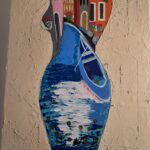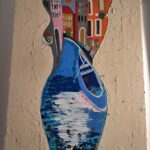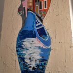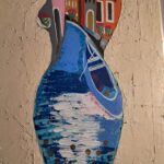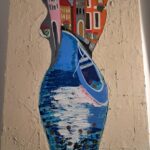 Obraz jest pokryty grubą ,nierówną strukturą imitującą ścianę budynku pomalowałam ją na kolor kremowy ,co ociepliło dzieło