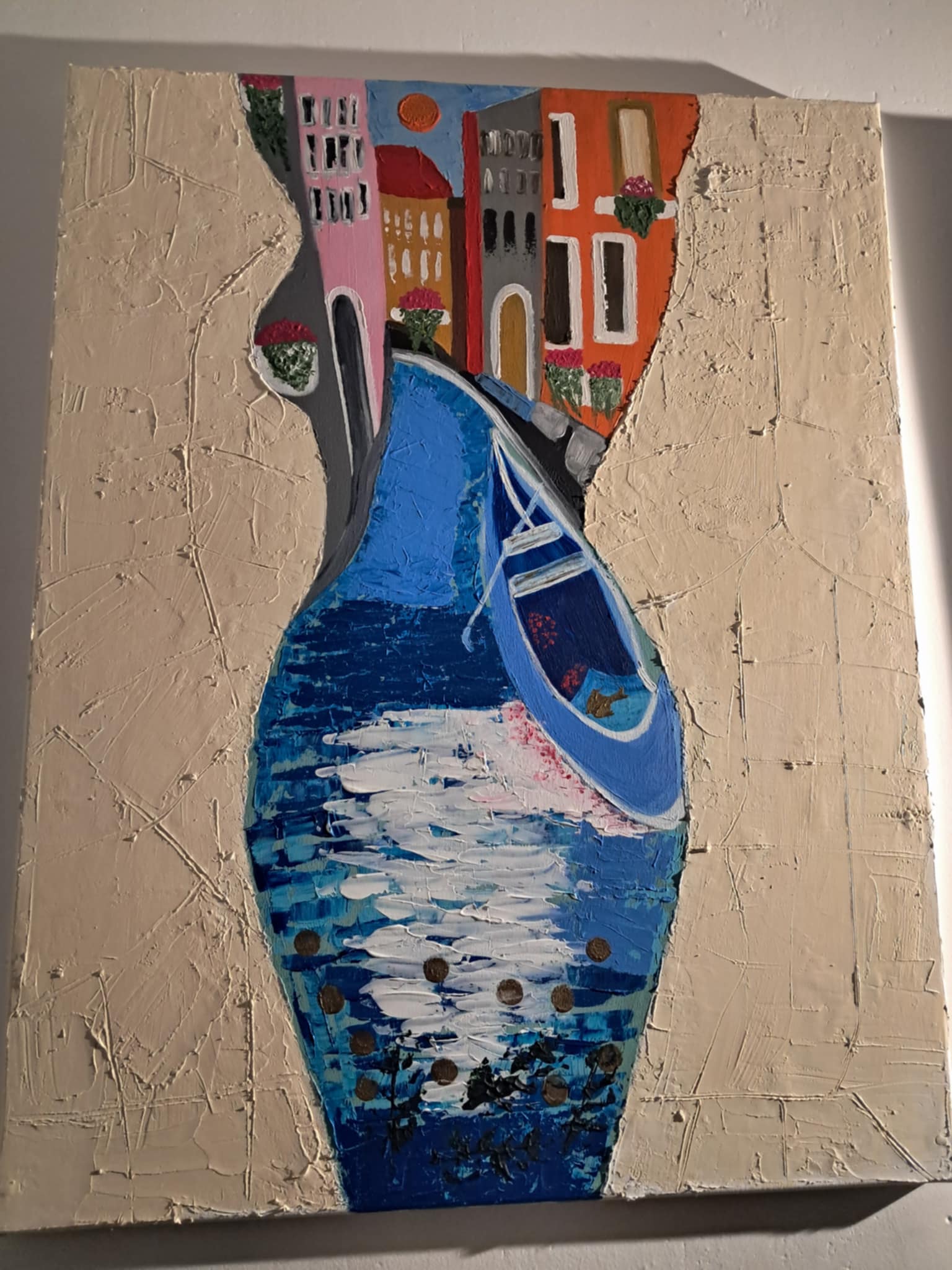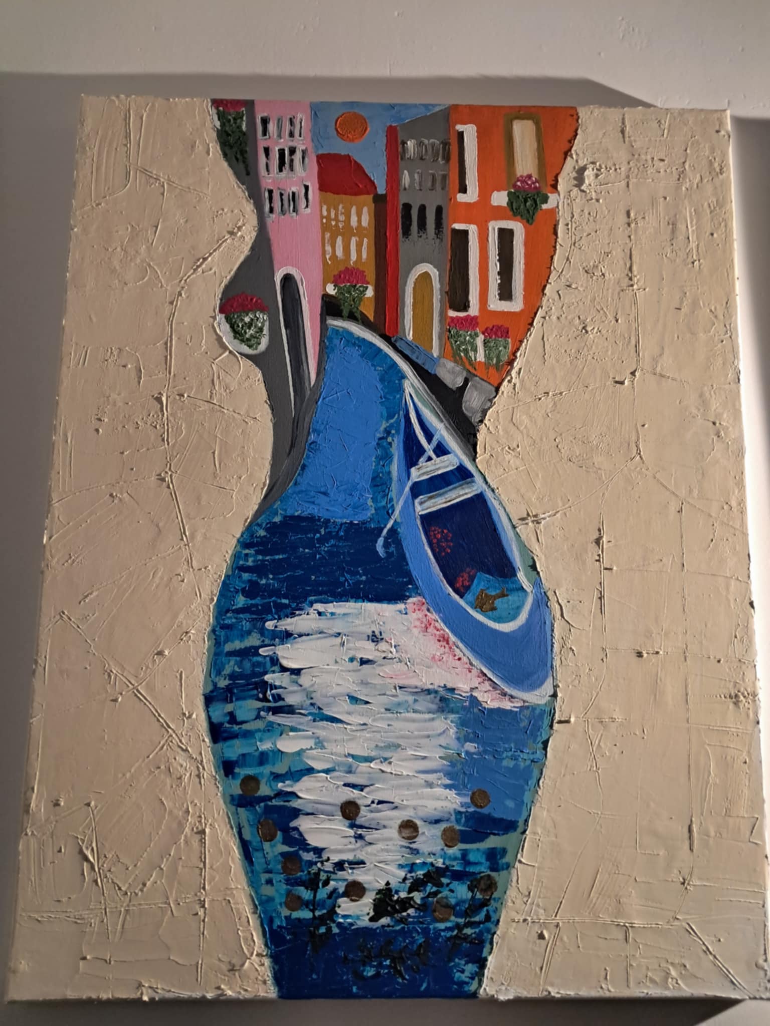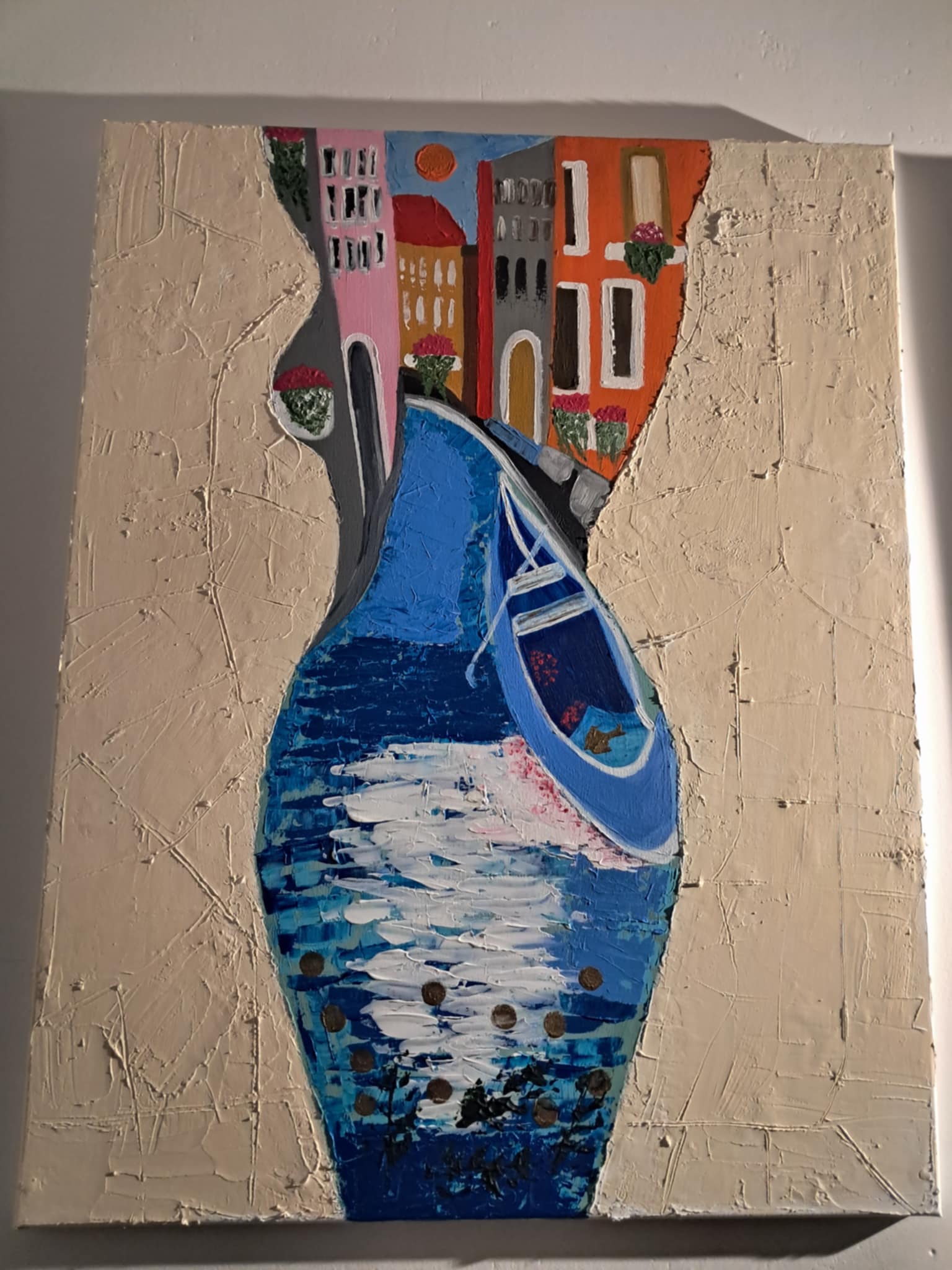 Obraz jest pokryty grubą ,nierówną strukturą imitującą ścianę budynku pomalowałam ją na kolor kremowy ,co ociepliło dzieło