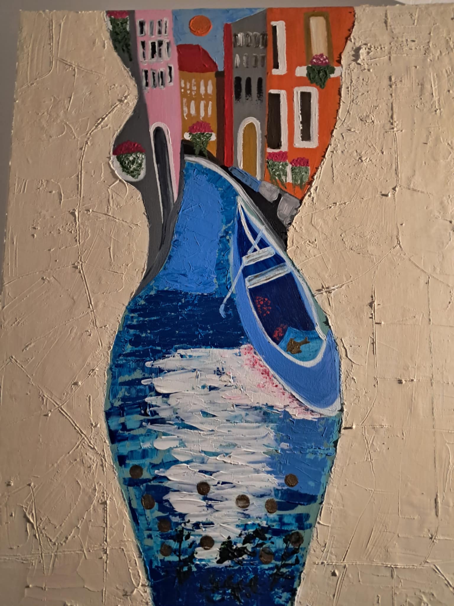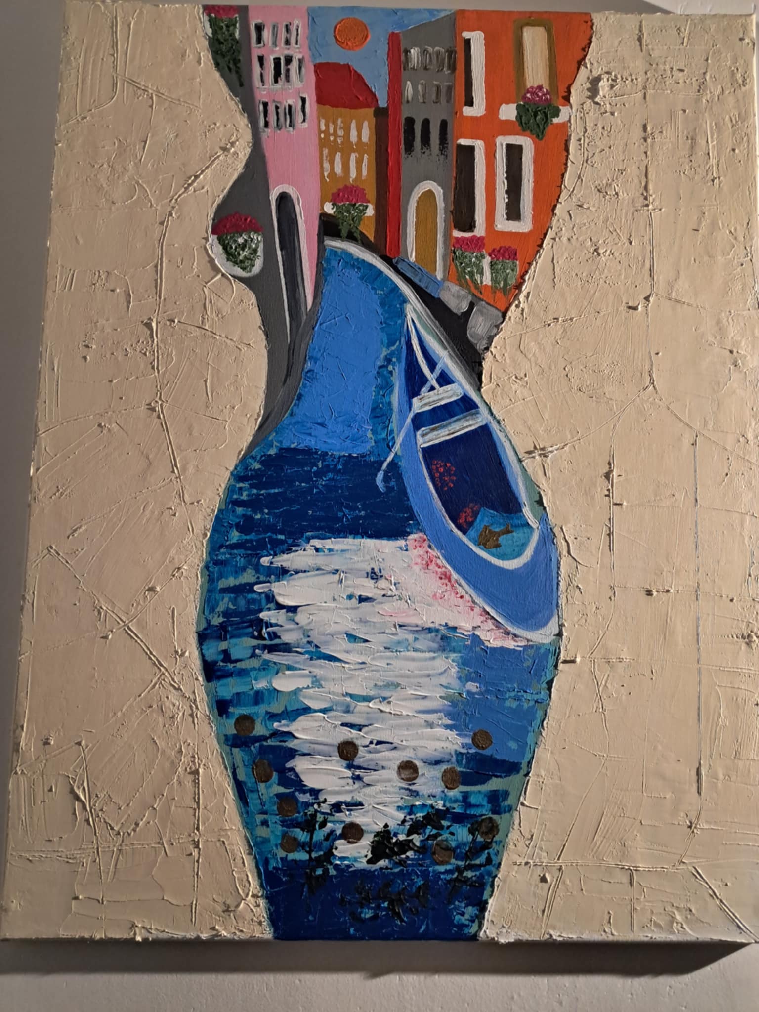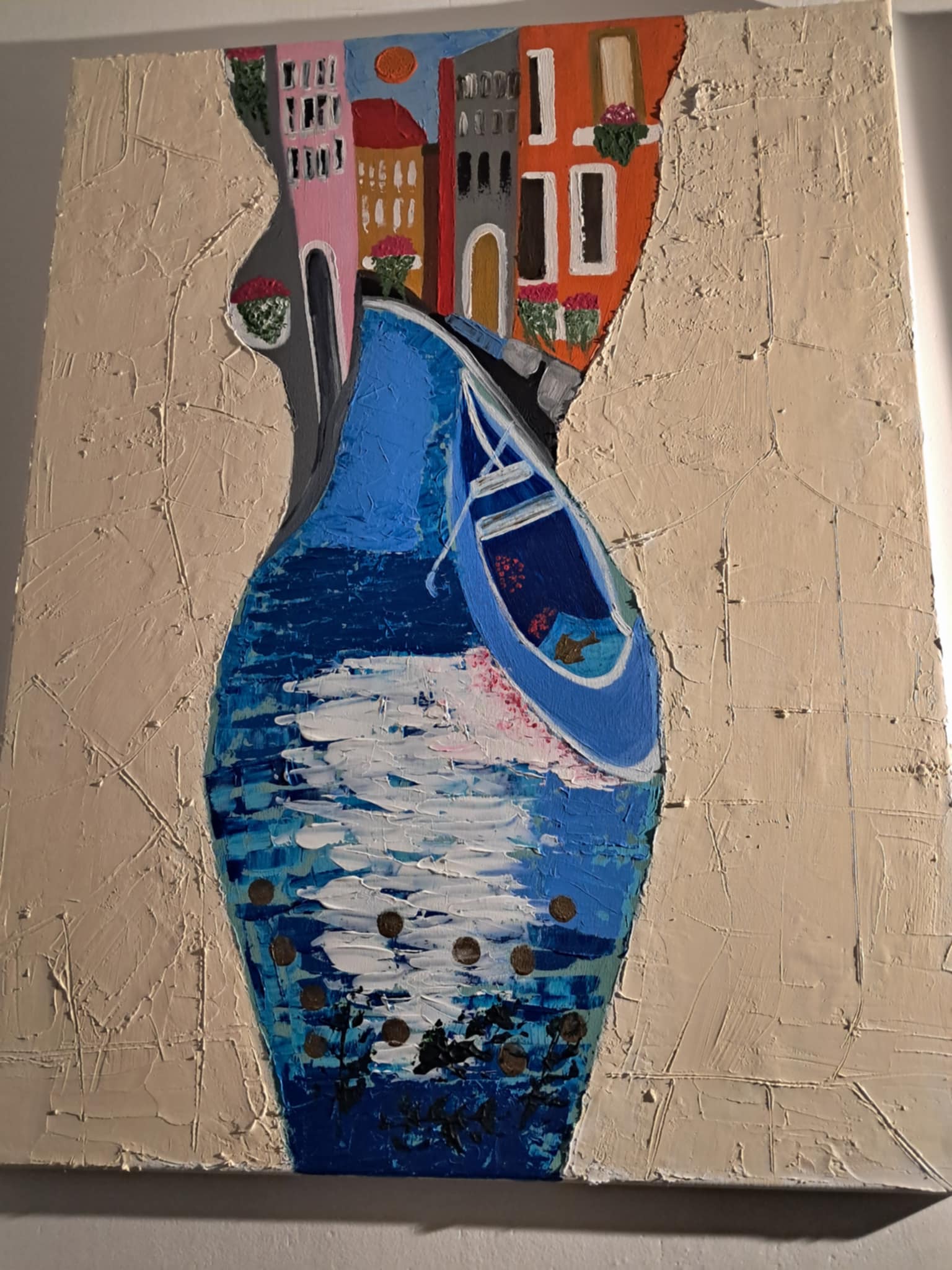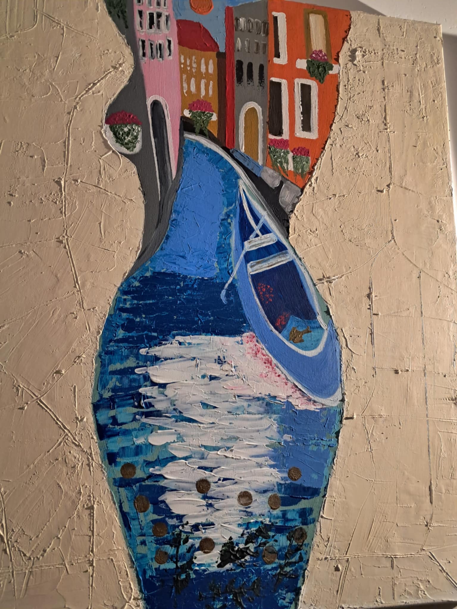 Obraz jest pokryty grubą ,nierówną strukturą imitującą ścianę budynku pomalowałam ją na kolor kremowy ,co ociepliło dzieło