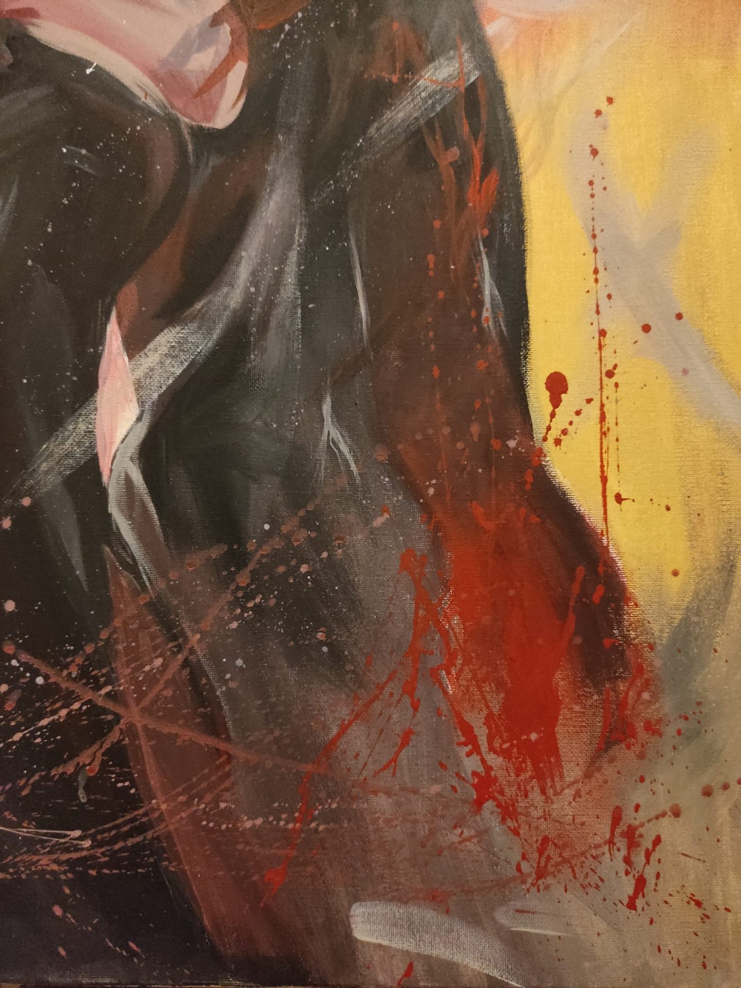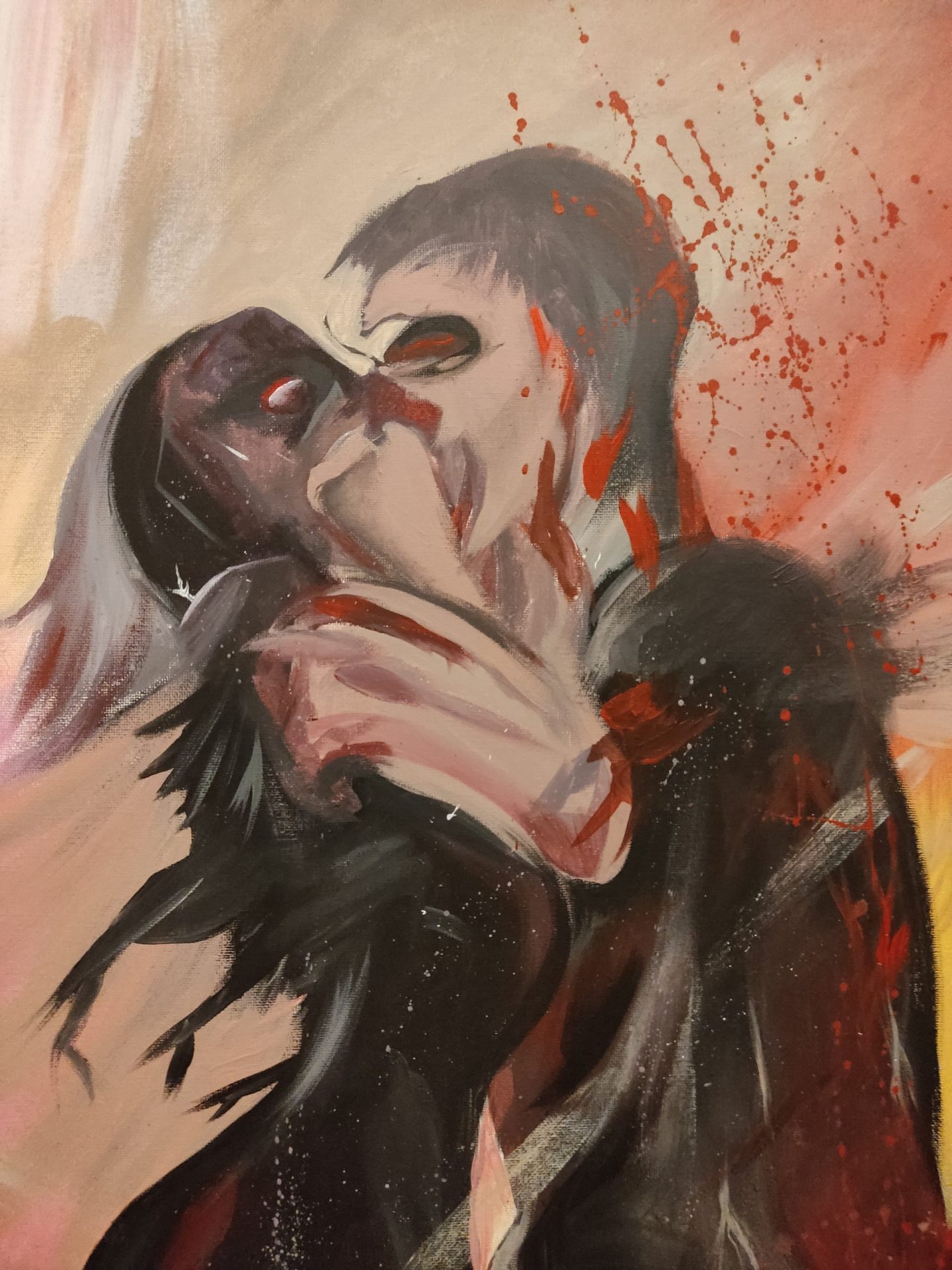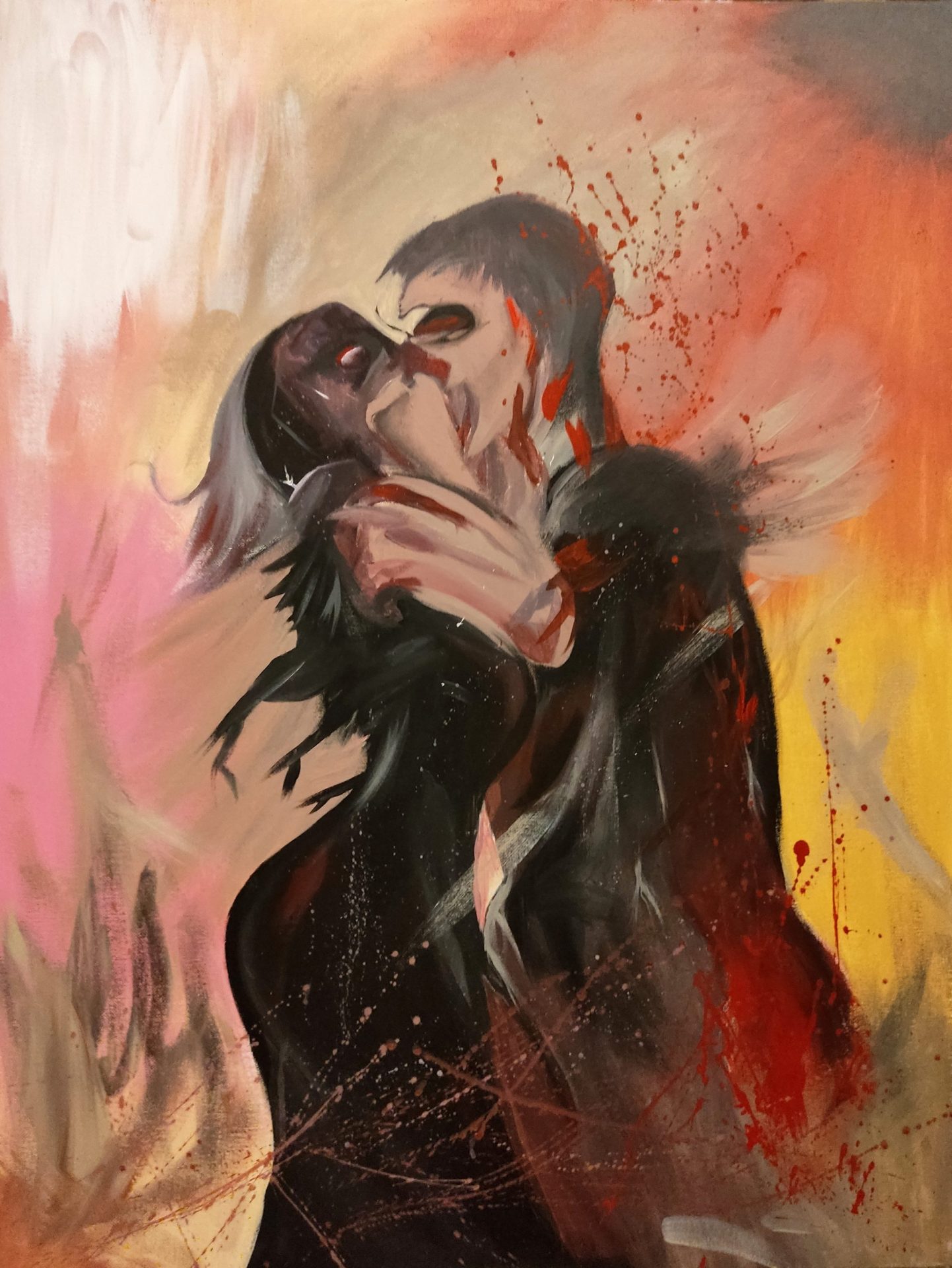 Duży obraz namalowany akrylami na płótnie o wymiarach 80×60 przedstawiający motyw trudnej miłości, gorącego romansu który mimo, że jest krzywdzący dla mężczyzny , ten nie potrafi opuścić kobiety. Pełnia kolorów wokół symbolizować ma teoretyczne szczęście które coraz bardziej ulega zniszczeniu.