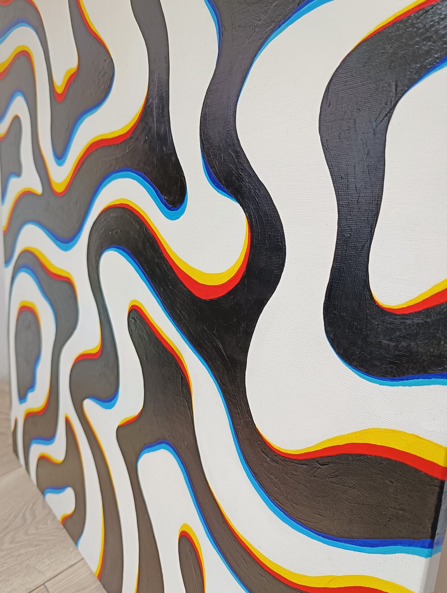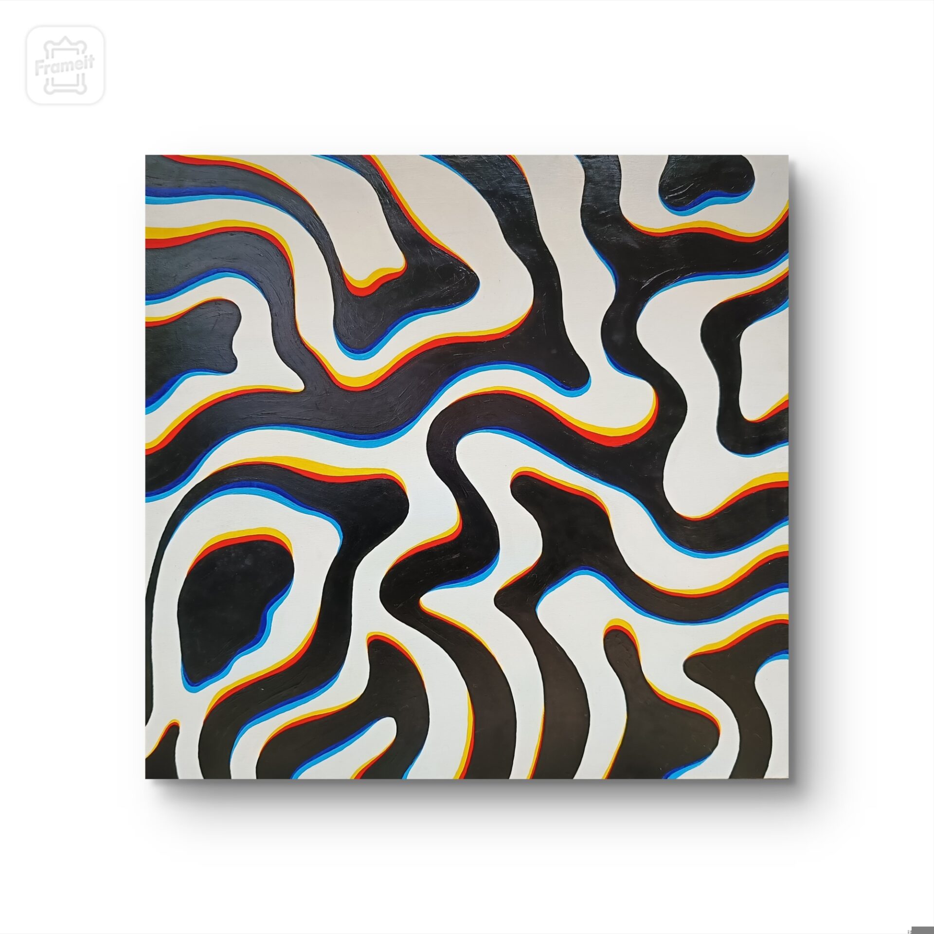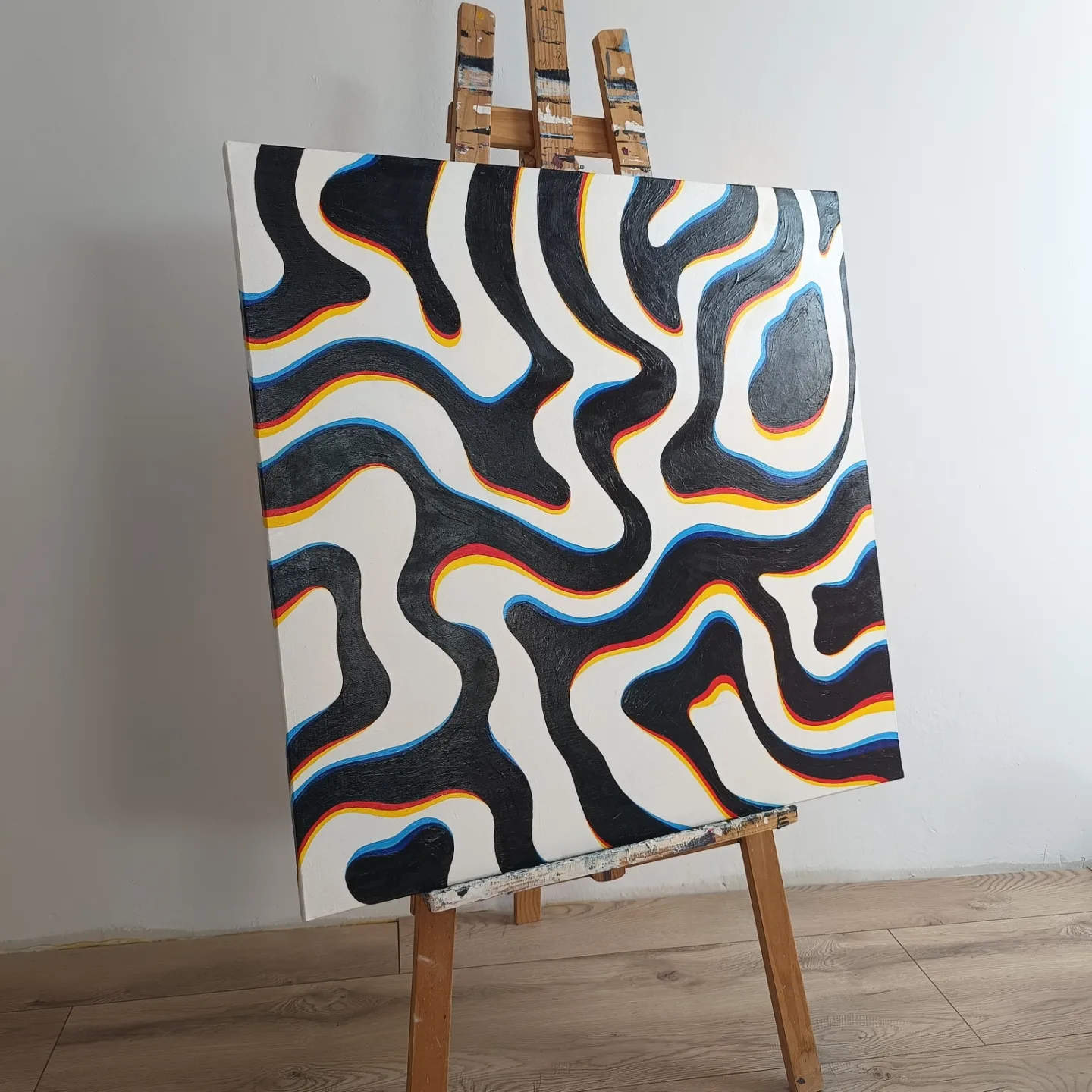 Obraz Energia namalowany jest farbami akrylowymi na podobraziu bawełnianym, jest wykończony werniksem matowym.