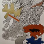 Obraz wykonany czarnymi i kolorowymi cienkopisami różnej grubości. Papier biały wymiar a4. Na życzenie rama czarna lub kolor drewna format a4.