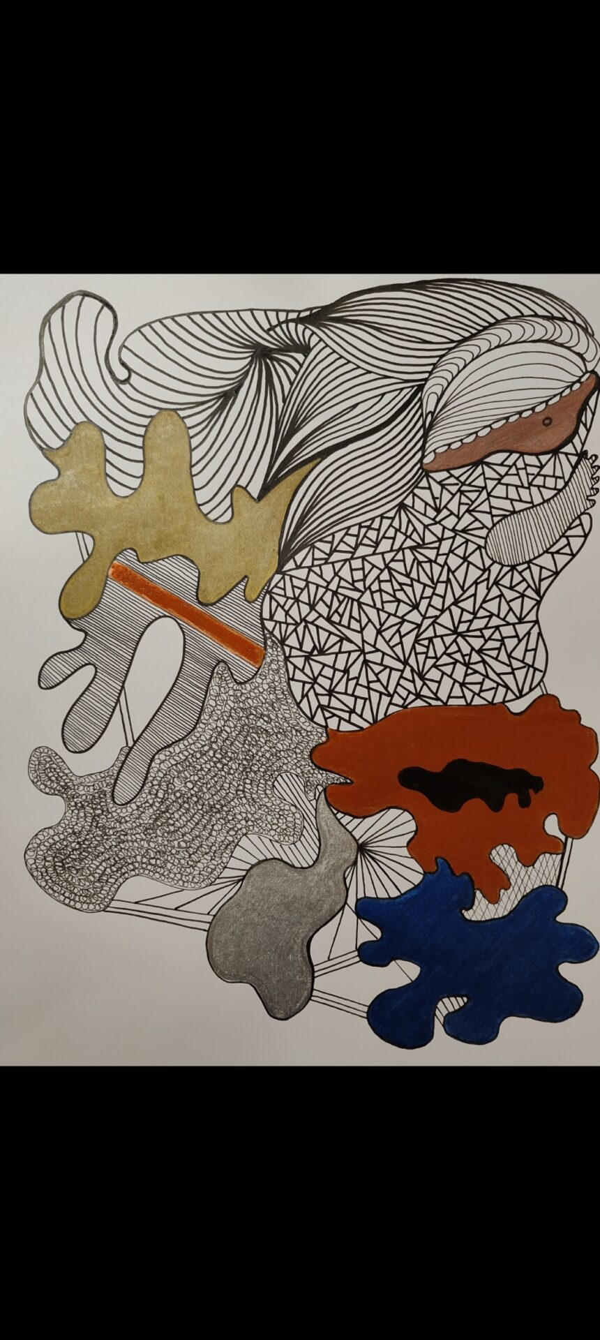 Obraz wykonany czarnymi i kolorowymi cienkopisami różnej grubości. Papier biały wymiar a4. Na życzenie rama czarna lub kolor drewna format a4.
