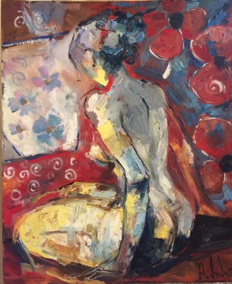 Erotyka w stylu modernistycznym kobiety przed lustrem.