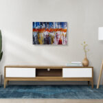 Ta praca artystyczna przynosi uczucie spokoju i równowagi dzięki głębokim odcieniom niebieskiego, jednocześnie wprowadzając subtelny kontrast za sprawą wprowadzenia bardziej żywych tonacji kolorów. Kompozycja pionowych maźnięć tworzy dynamiczną strukturę, co nadaje obrazowi unikalny charakter.