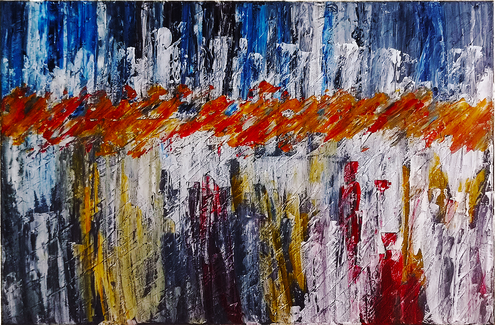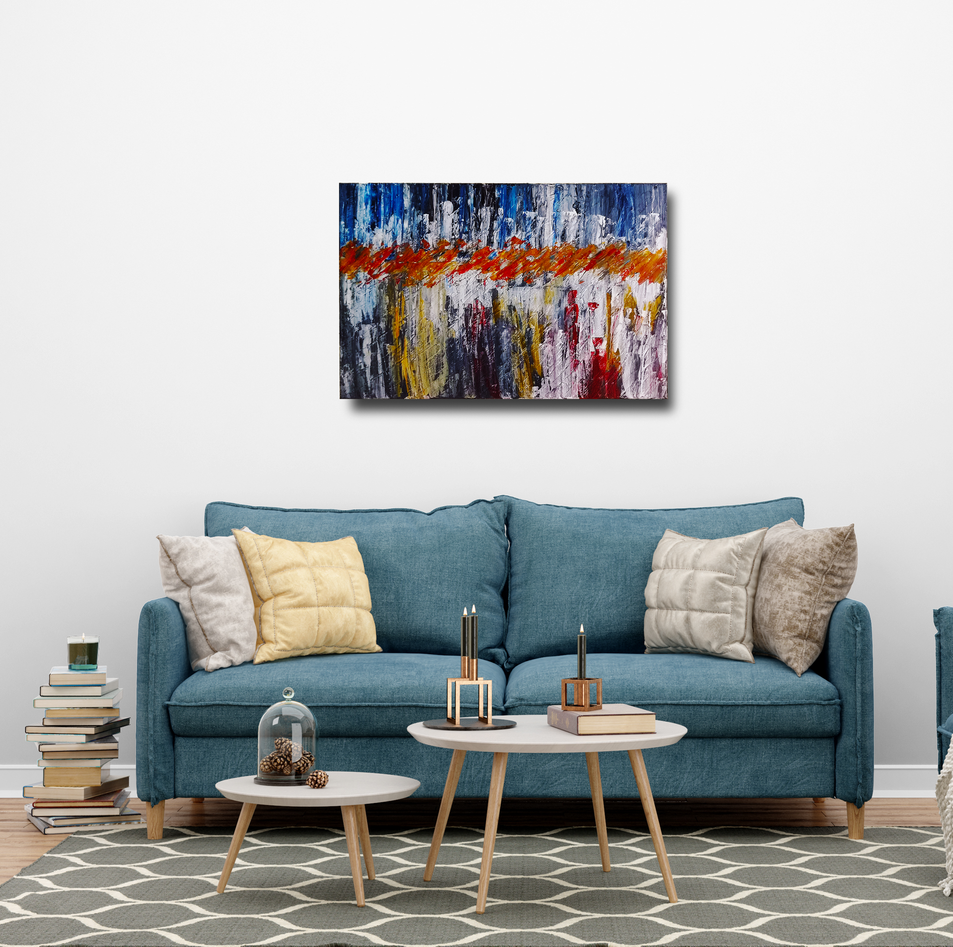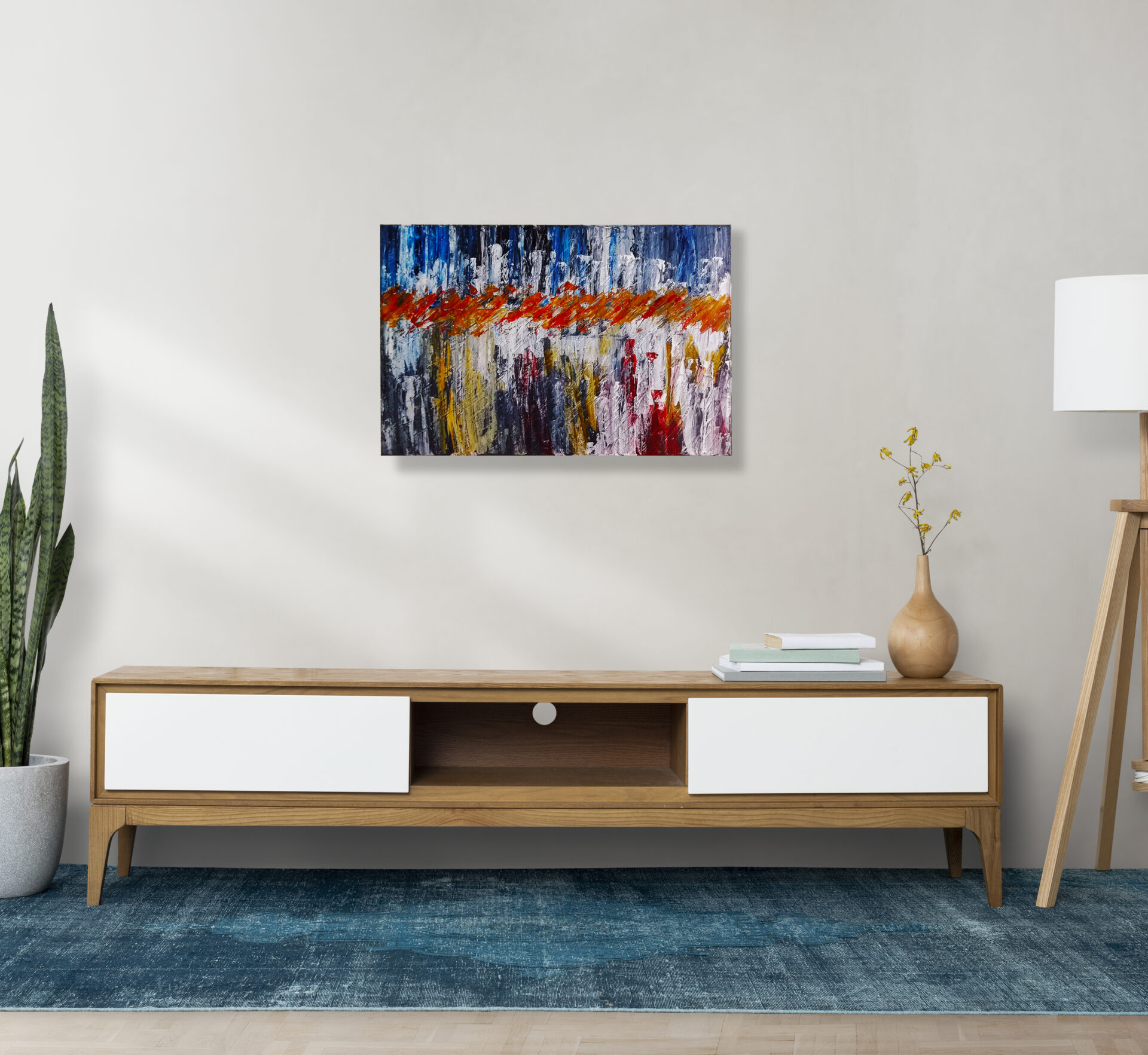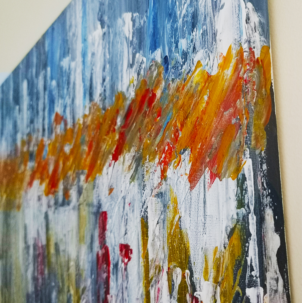 Ta praca artystyczna przynosi uczucie spokoju i równowagi dzięki głębokim odcieniom niebieskiego, jednocześnie wprowadzając subtelny kontrast za sprawą wprowadzenia bardziej żywych tonacji kolorów. Kompozycja pionowych maźnięć tworzy dynamiczną strukturę, co nadaje obrazowi unikalny charakter.