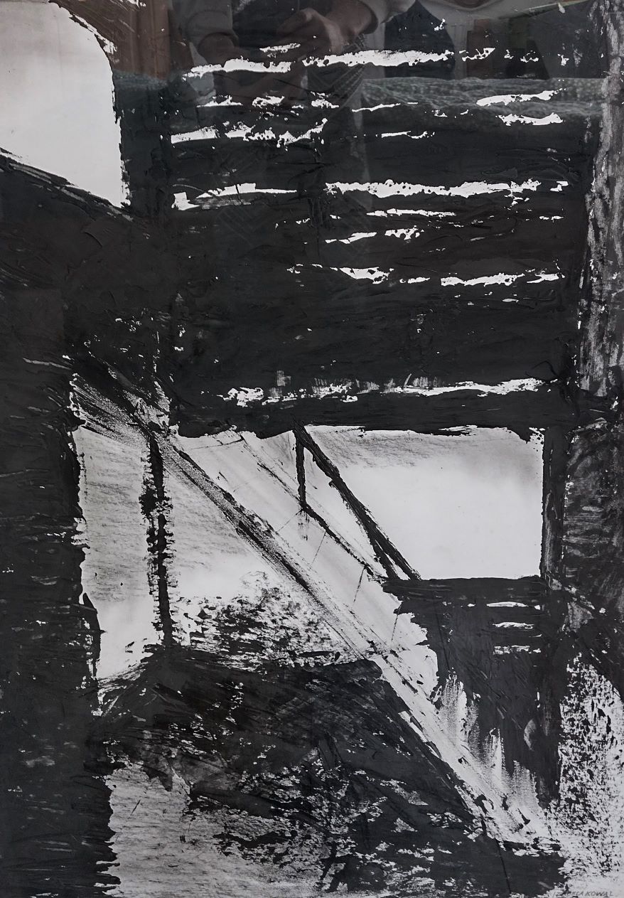 Malarstwo na papierze w tonach bieli , czerni i szarości, antyrama z pleksi. Pierwszy z serii „Fabryka”, zapraszam do obejrzenia pozostałych prac