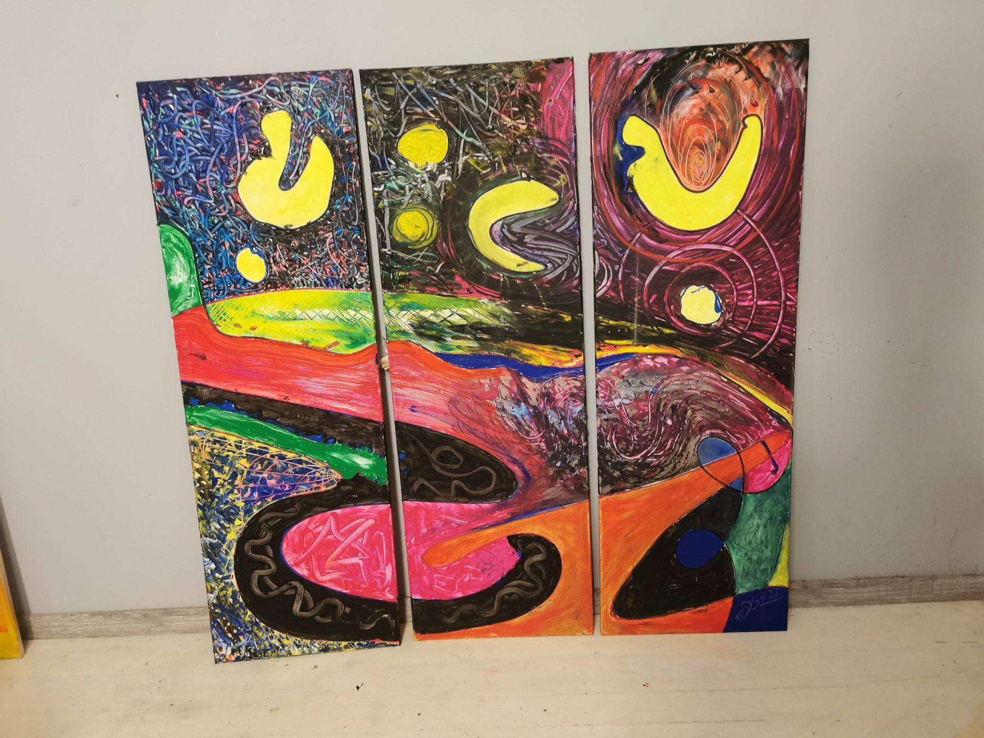 „Fajne miejsce” to aż trzy obrazy namalowane na płótnie . Każdy z nich o rozmiarze 40×120 cm .