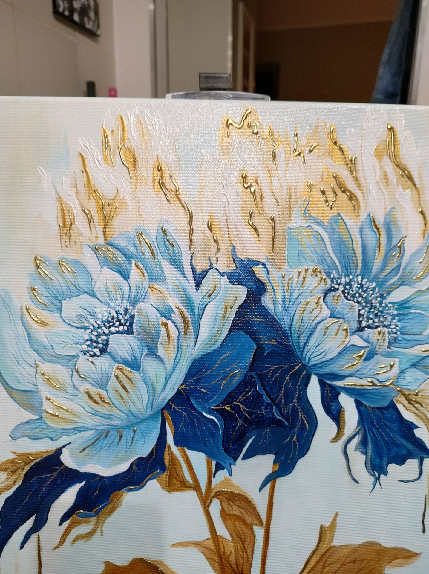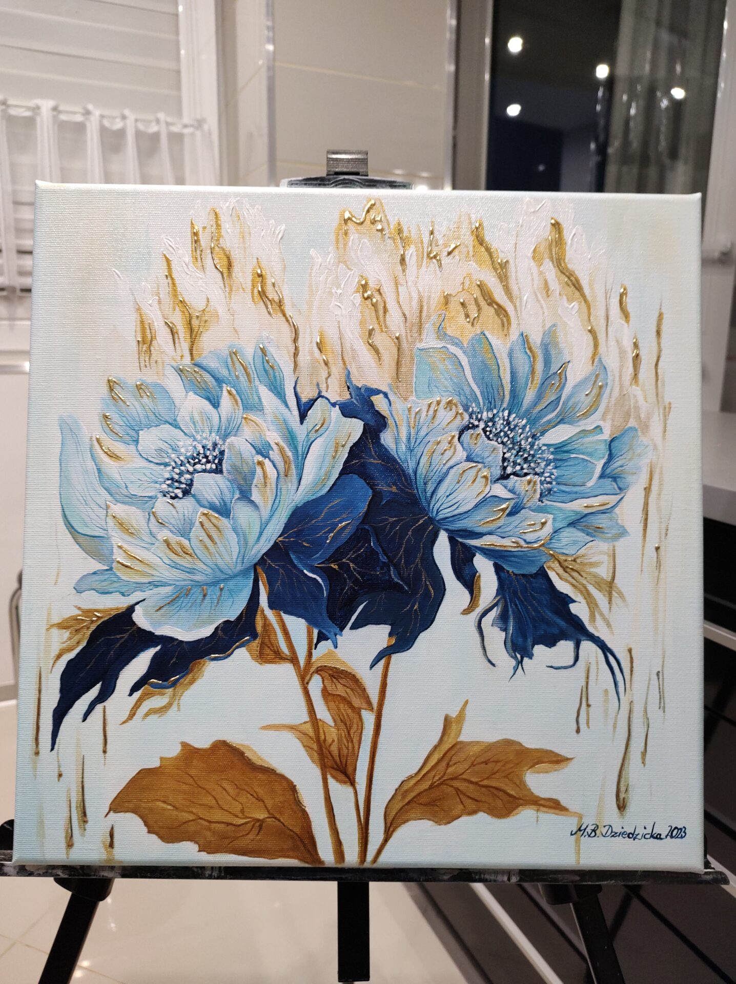 Przedstawiam obraz z serii Fantazyjne kwiaty, pt.: „Fantazyjne piwonie” mojego autorstwa, namalowany profesjonalnymi farbami akrylowymi na bawełnianym podobraziu 3D (szerokość blejtramy 3 cm), pokryty grubym płótnem włoskim o doskonałej jakości. Boki obrazu zostały zamalowane zgodnie z kolorystyką tła. Całość wykończyłam werniksem z połyskiem. Obraz nie wymaga zakupu ramy – jest gotowy do powieszenia. Wymiary 40 x 40 cm. Obraz w świetle się mieni, dzięki złotym akcentom ( na kwiatach, tle oraz liście zostały wykonane ze złotej farby oraz tzw. złota płatkowego). Podpis autora znajduje się na awersie i rewersie. Na życzenie klienta mogę wystawić certyfikat autentyczności. Obraz jest niepowtarzalny i elegancki, przykuwa uwagę. Doskonale przyozdobi zarówno salon, kuchnię, gabinet czy sypialnię. Świetnie również się sprawdzi jako prezent. Zapraszam również do obejrzenia innych moich prac.