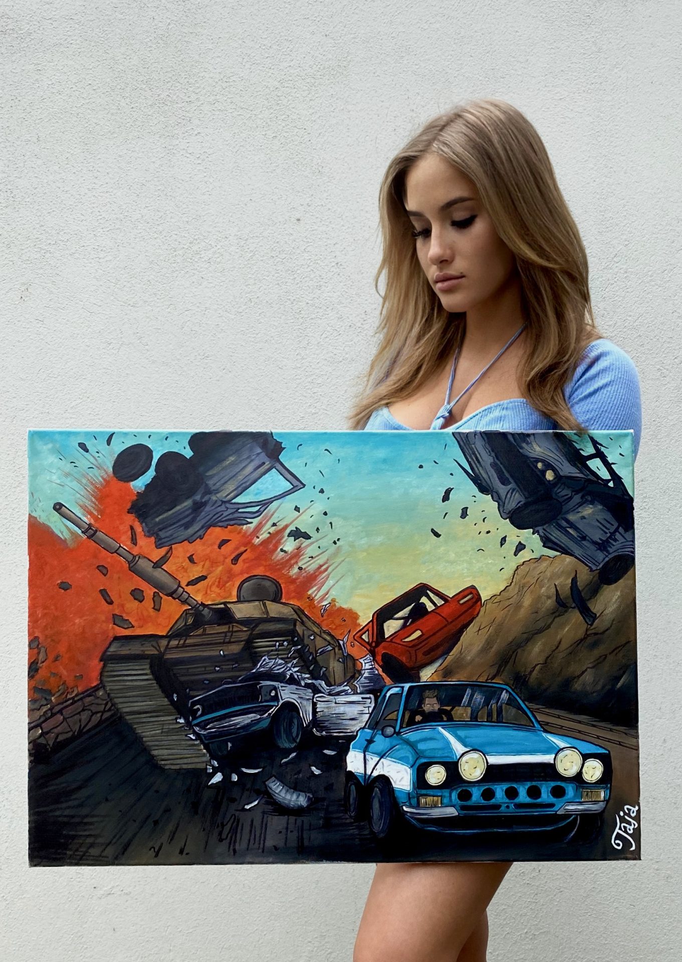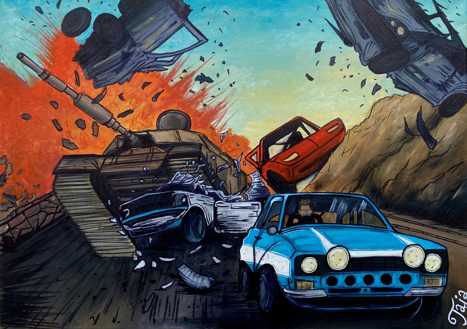 Scena z filmu „Fast and Furious 6”. Obraz namalowany farbami akrylowymi na podobraziu. Wymiary obrazu wynoszą 50/70 cm. Możliwość negocjacji ceny. Autor obrazu Natalia Begier.