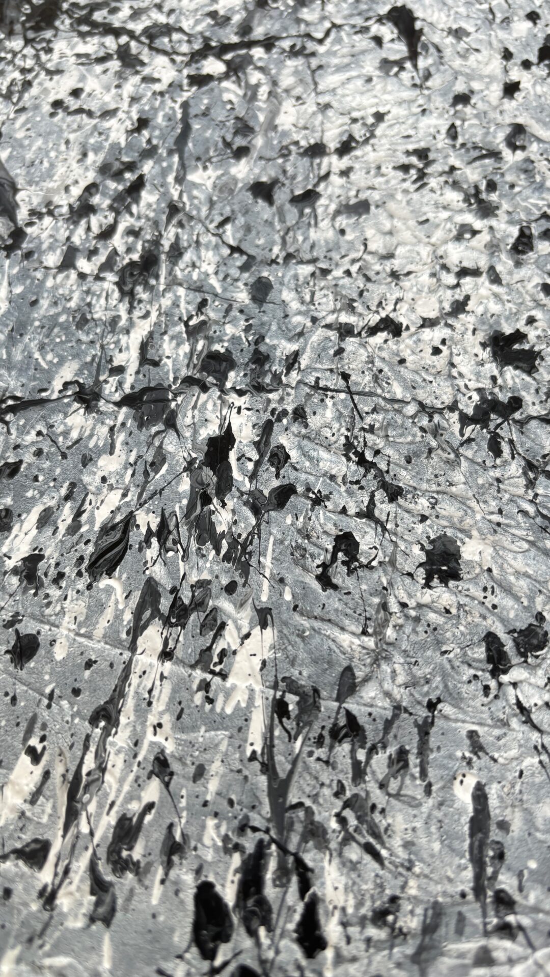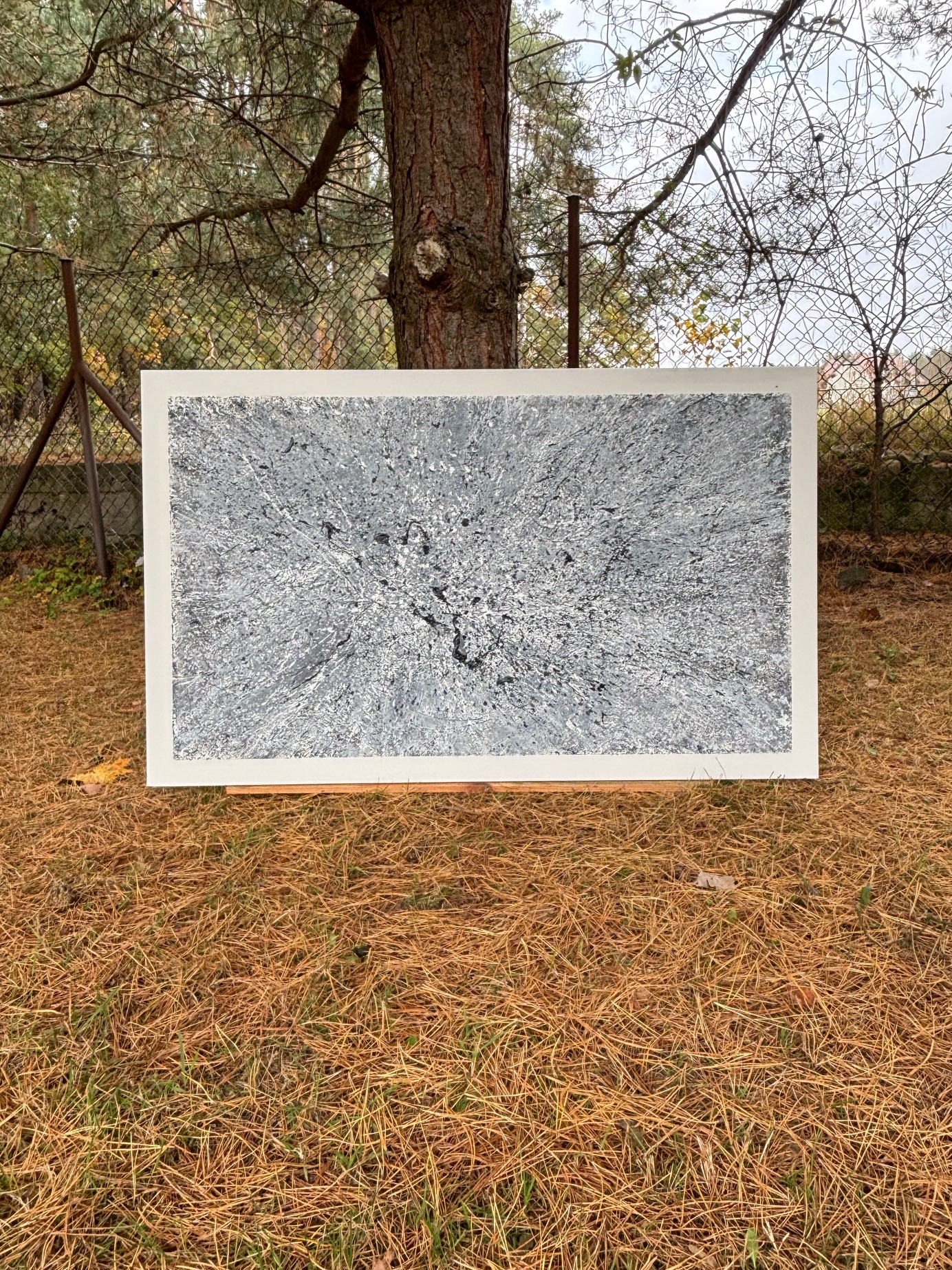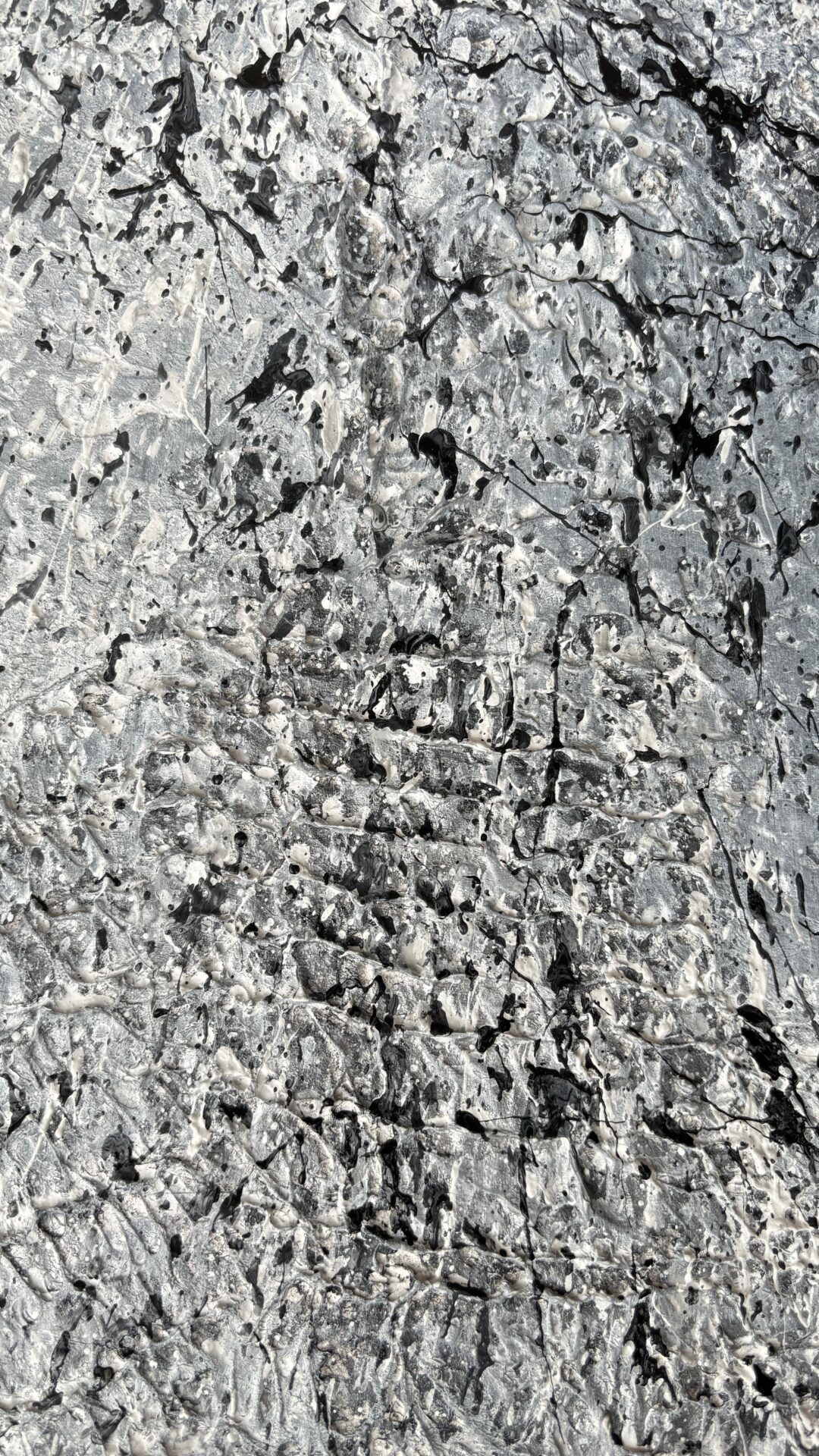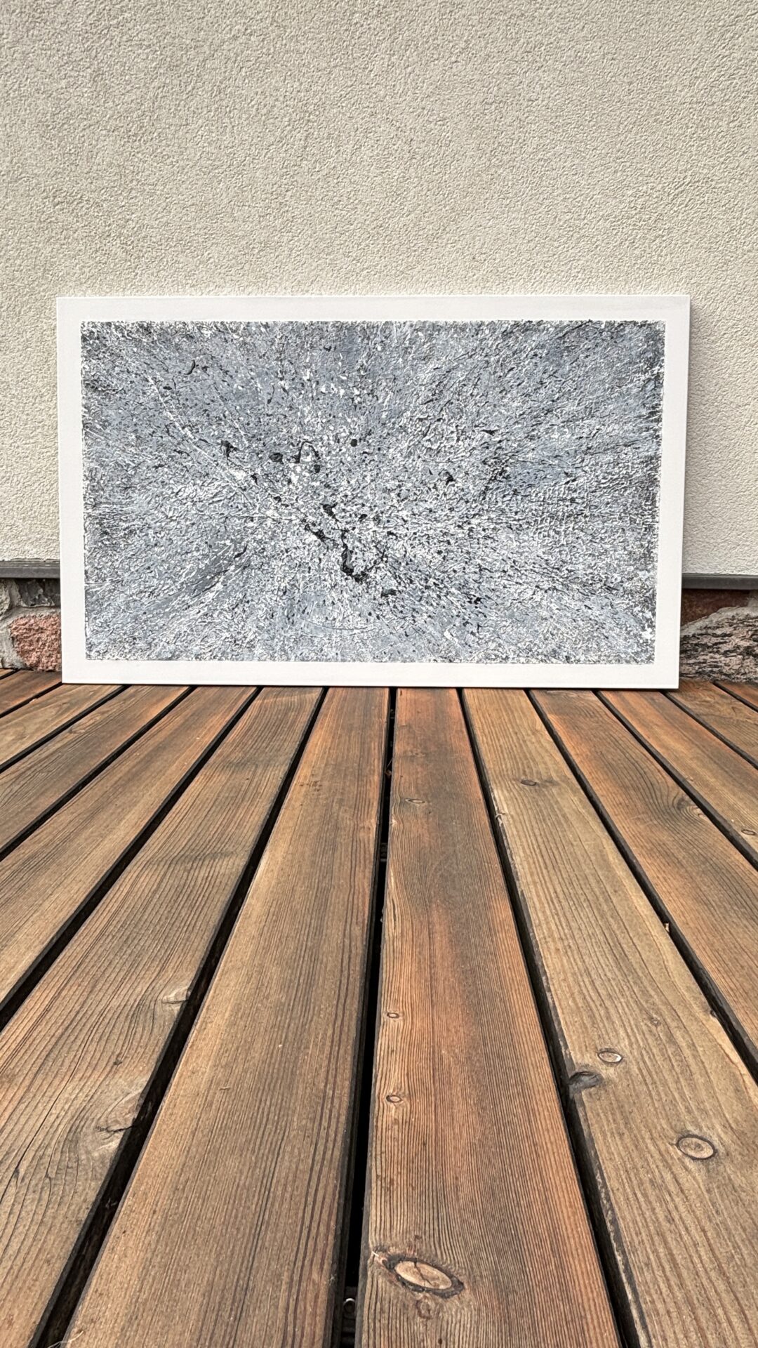 „Galaktyczna burza”. Kolorystyka szara. Forma strukturalna. Płótno, akryl 130×80. Oprawiony w czarną ramę.