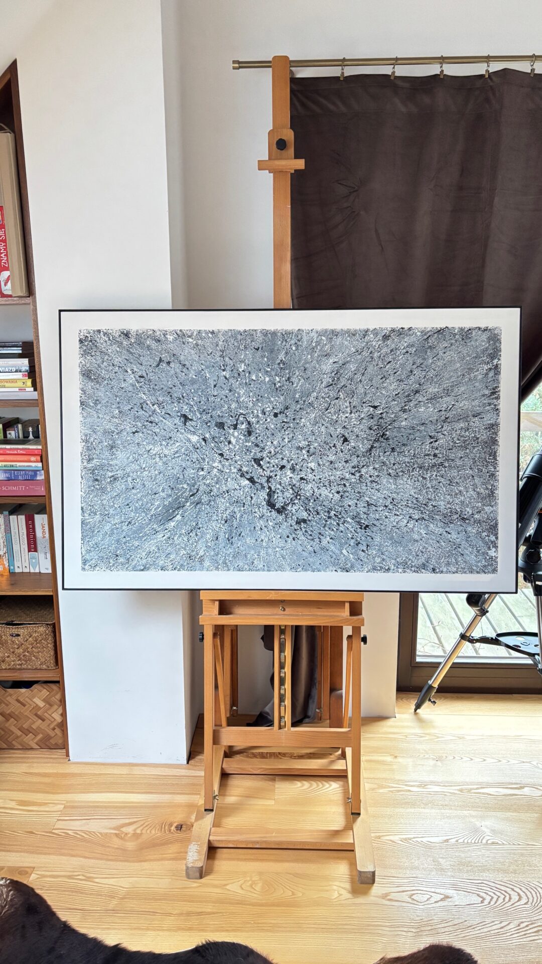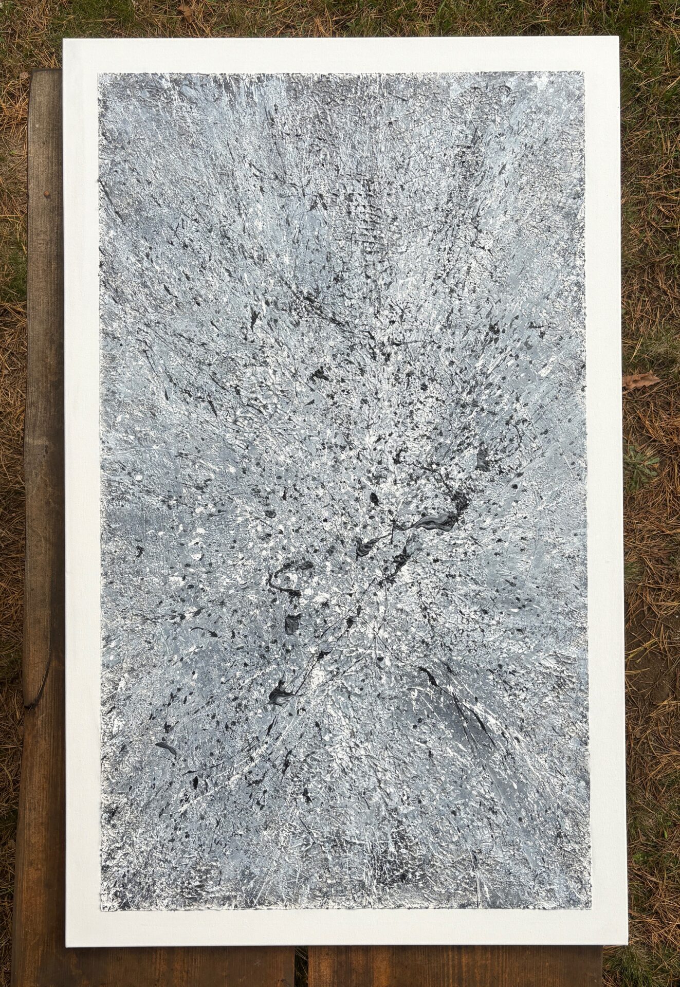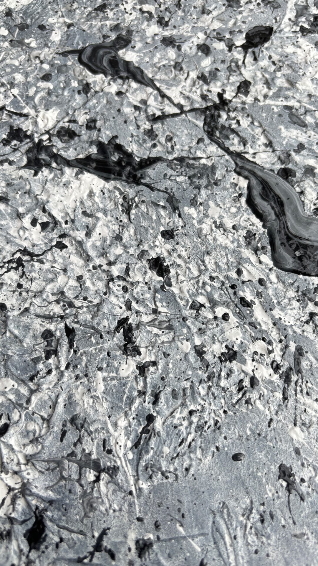 „Galaktyczna burza”. Kolorystyka szara. Forma strukturalna. Płótno, akryl 130×80. Oprawiony w czarną ramę.