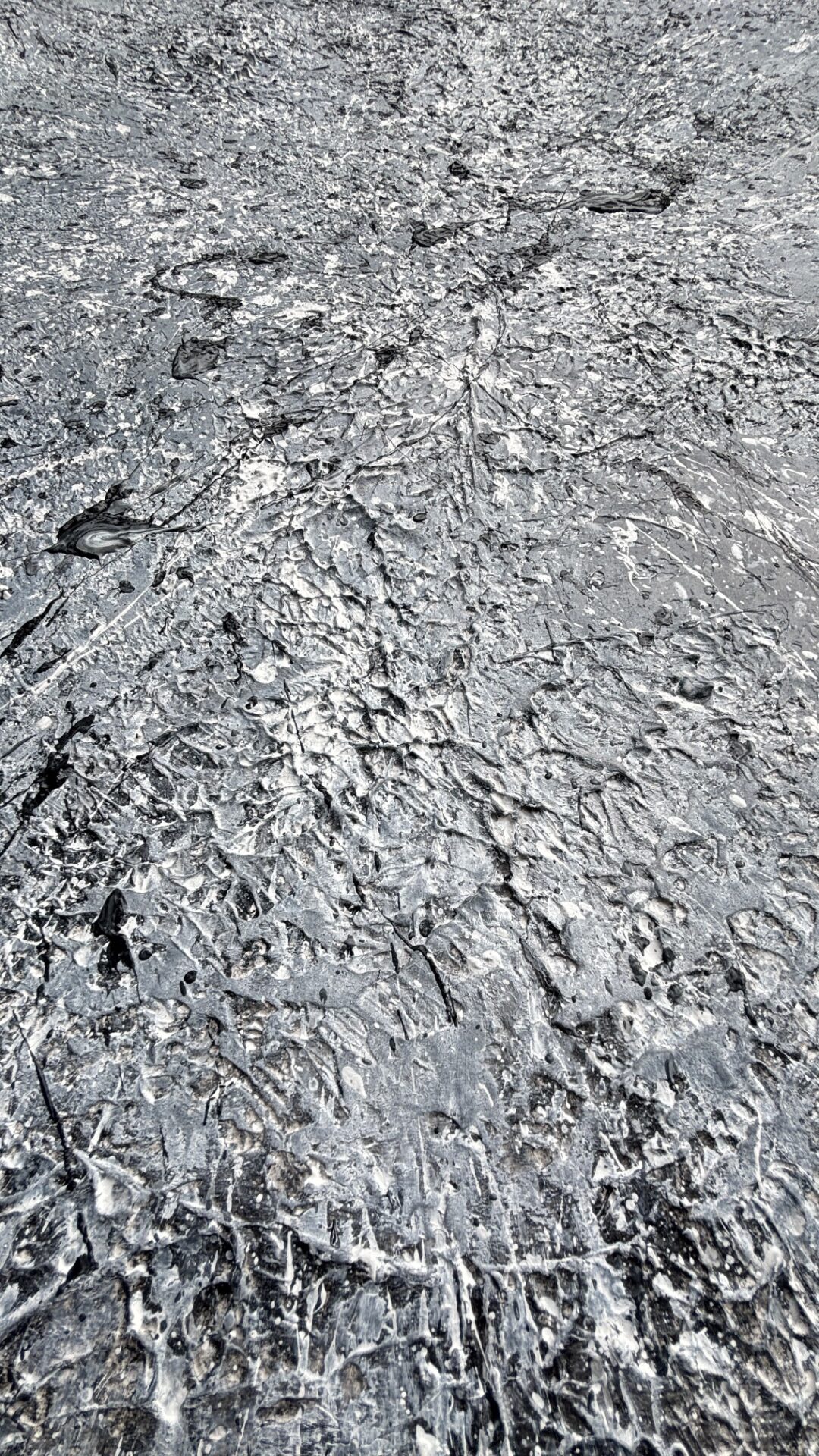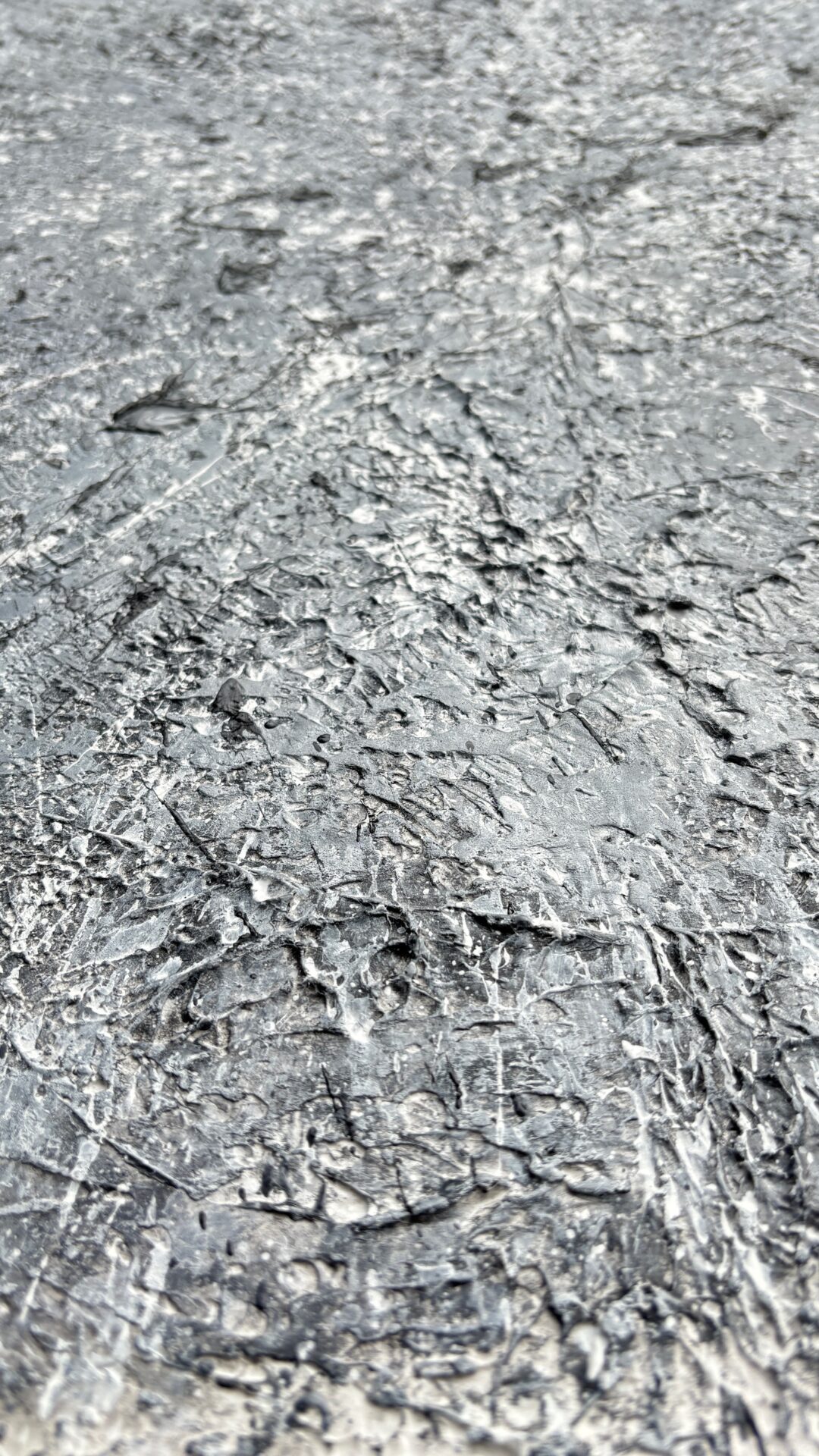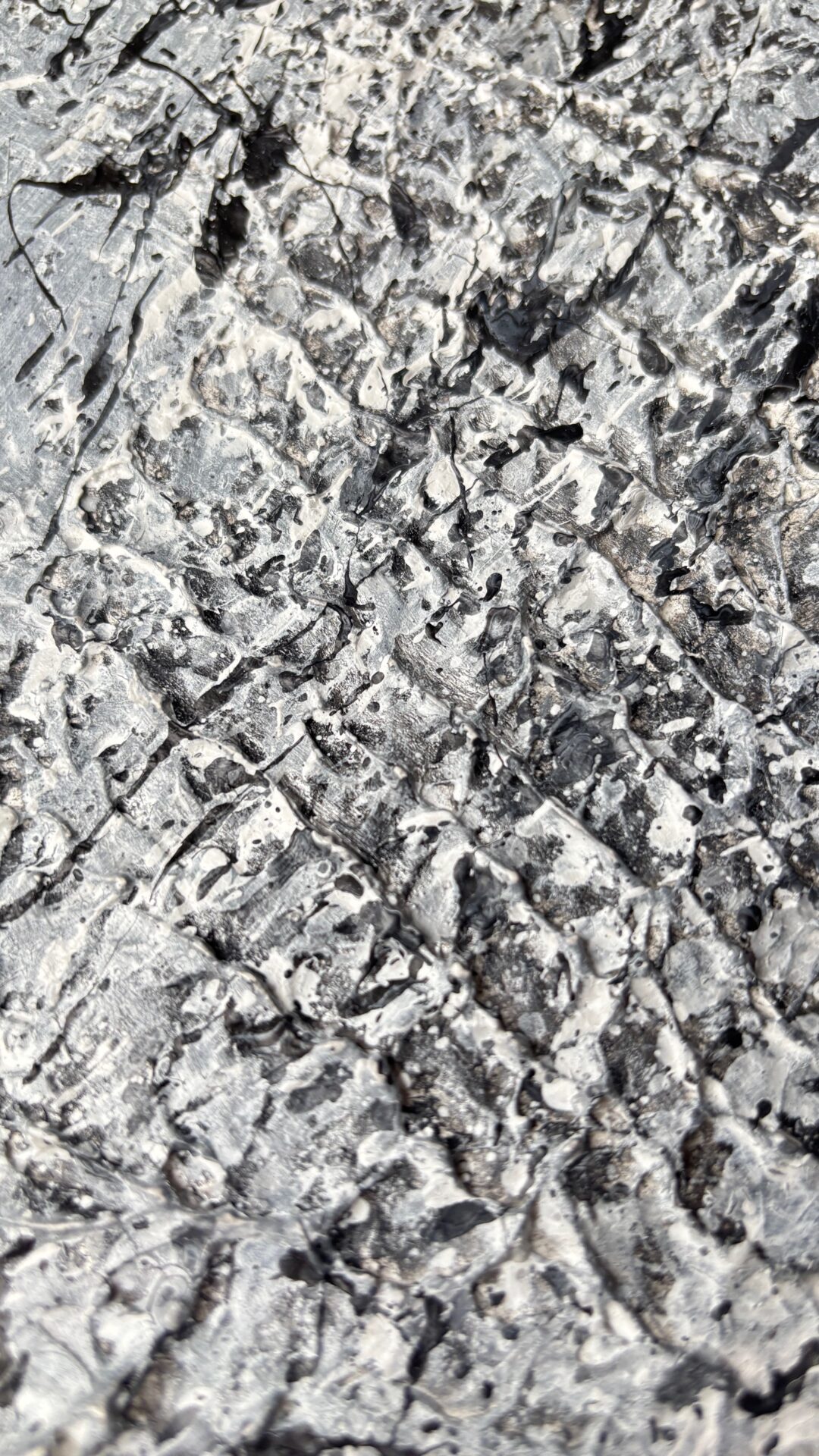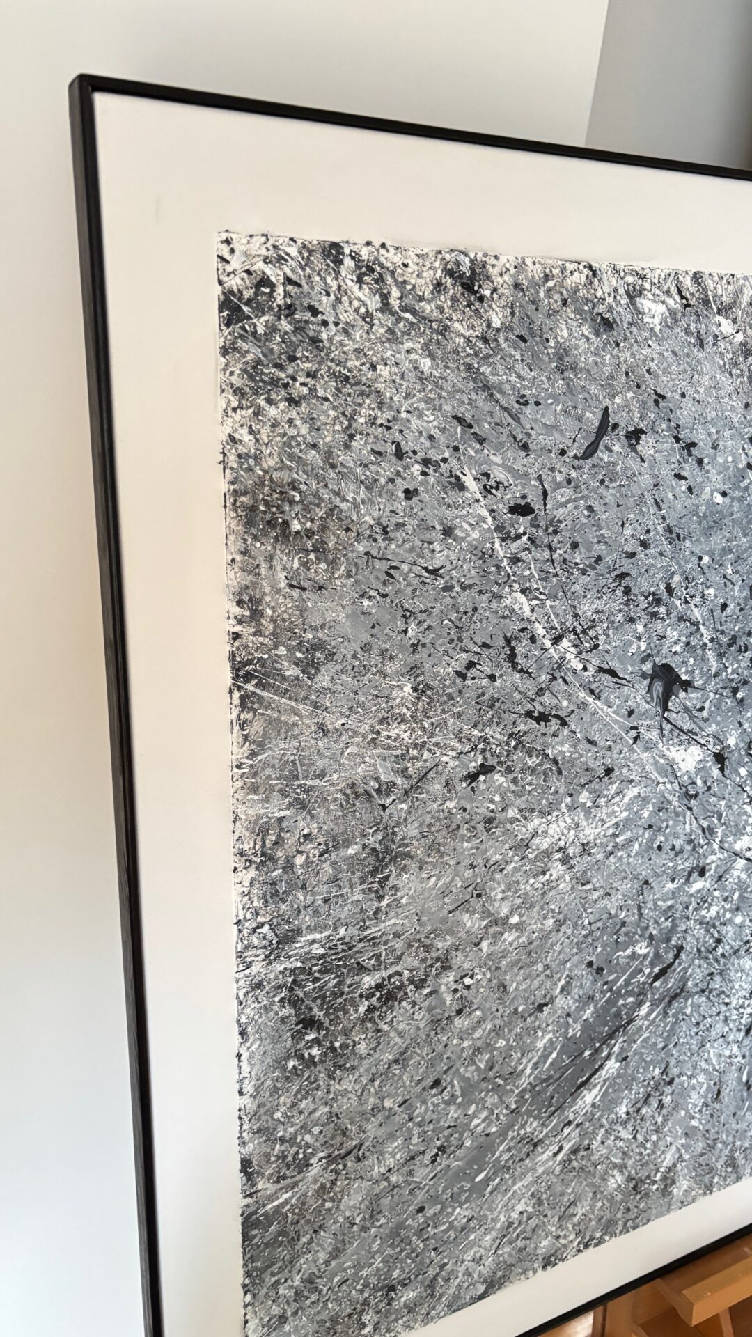 „Galaktyczna burza”. Kolorystyka szara. Forma strukturalna. Płótno, akryl 130×80. Oprawiony w czarną ramę.