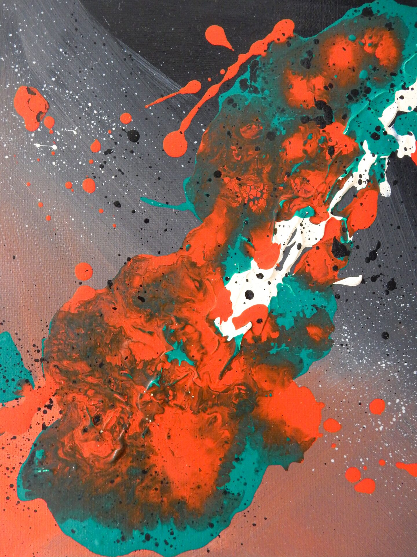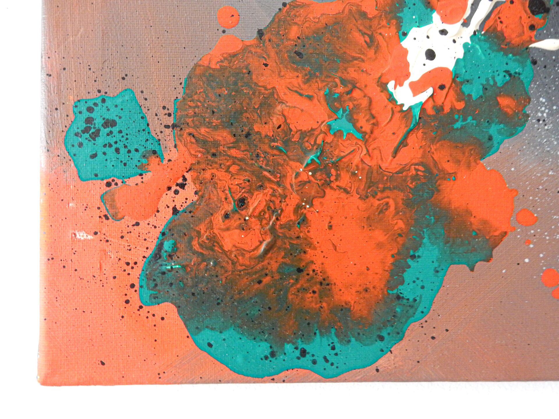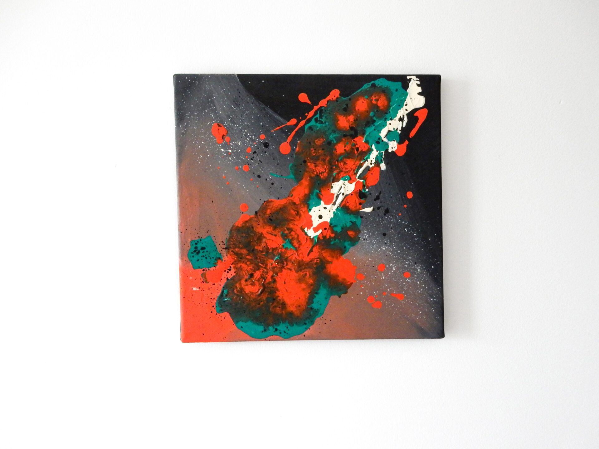 Informacje podstawowe: akryl na płótnie bawełnianym (gruntowanym) 30×30 cm. Barwy: czerń, biel, zieleń, pomarańcz. Boki czarne. OBRAZ POSIADA W NIEKTÓRYCH MIEJSCACH WYPUKŁE ELEMENTY CO SPRAWIA, ŻE WYGLĄDA JESZCZE BARDZIEJ REALNIE.