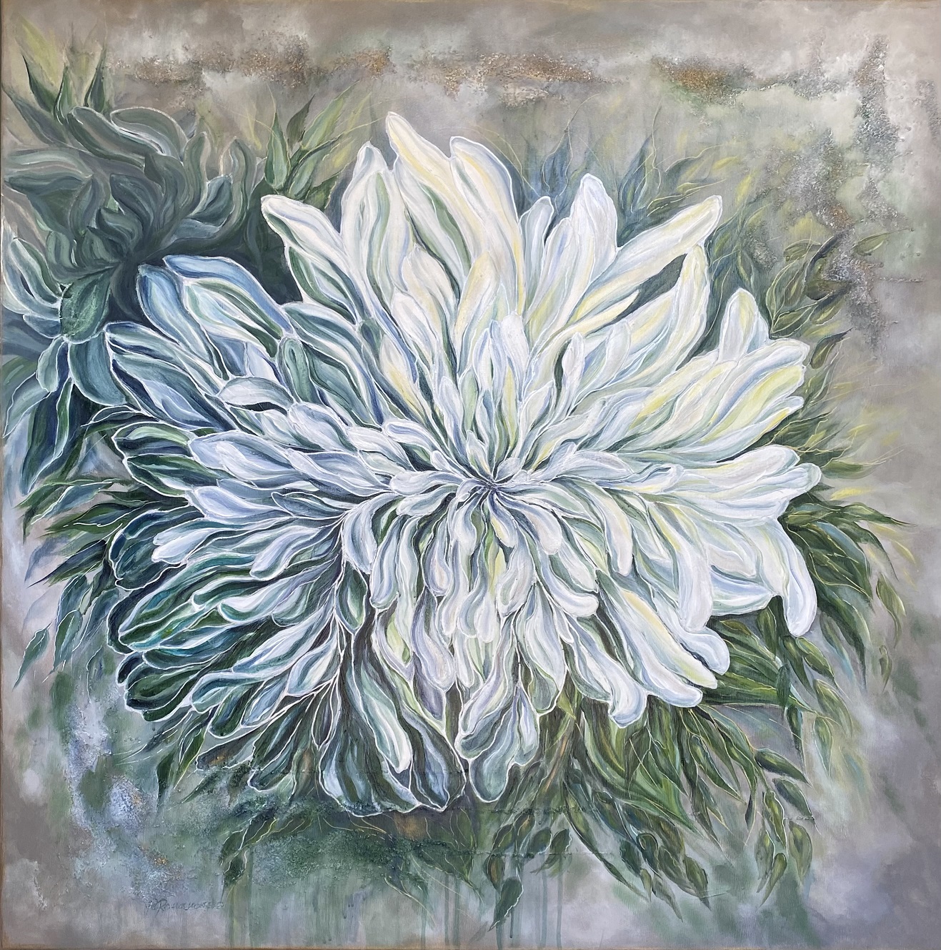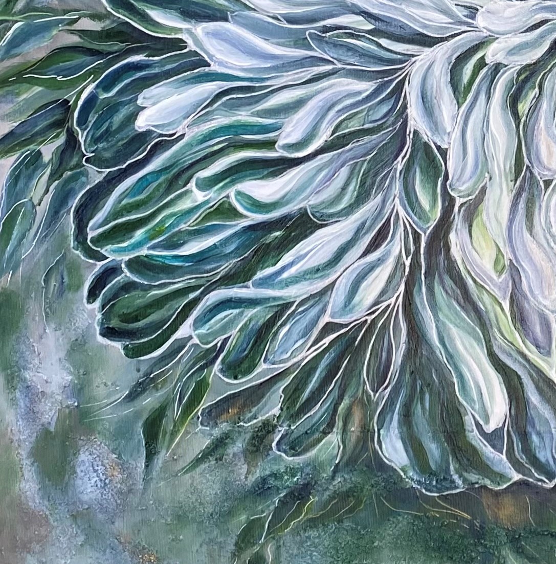 Obraz inspirowany pięknem świata natury, wykonany techniką akrylową, utrzymany w szaro-szmaragdowej tonacji. Wymiary 100×100 cm.