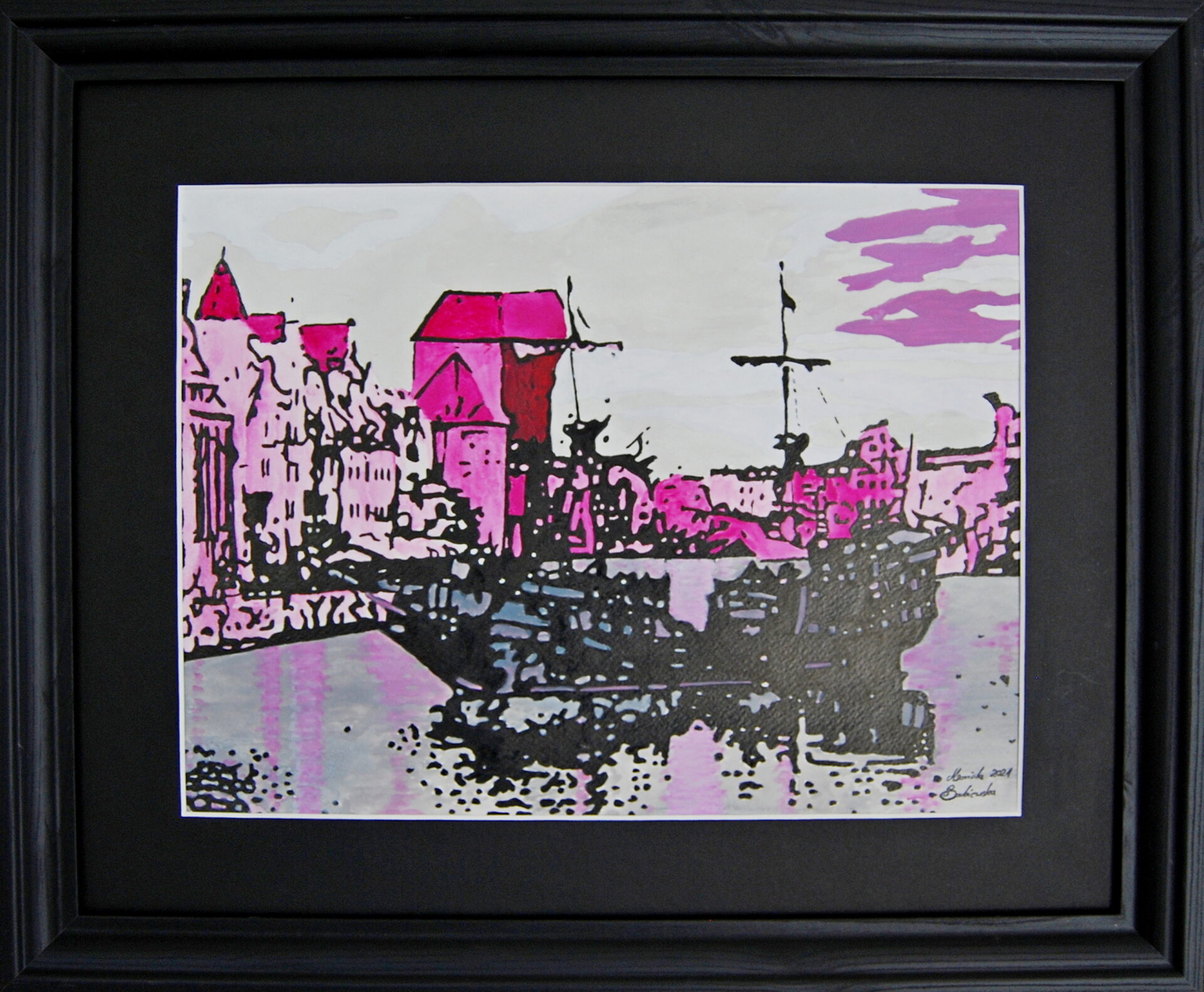 „Gdańsk Żuraw i Statek Piracki”, 2021 należy do cyklu obrazów przedstawiających motywy dawnego i współczesnego Sopotu, Gdańska oraz Gdyni. Praca pozwoli podkreślić indywidualny charakter Twojego wnętrza oraz podnieść jego prestiż. Prace są niepowtarzalne, wykonane piórkiem, tuszem oraz farbami akwarelowymi i akrylowymi. Każda praca jest sygnowana i oprawiona w passe-partout oraz czarną elegancką ramę o wymiarach 57×47 cm gotowa do zawieszenia.