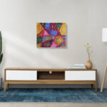 „Geometryczna Symfonia” to abstrakcyjne dzieło sztuki, które przyciąga uwagę widza za sprawą bogatych kolorów i geometrycznych kształtów.