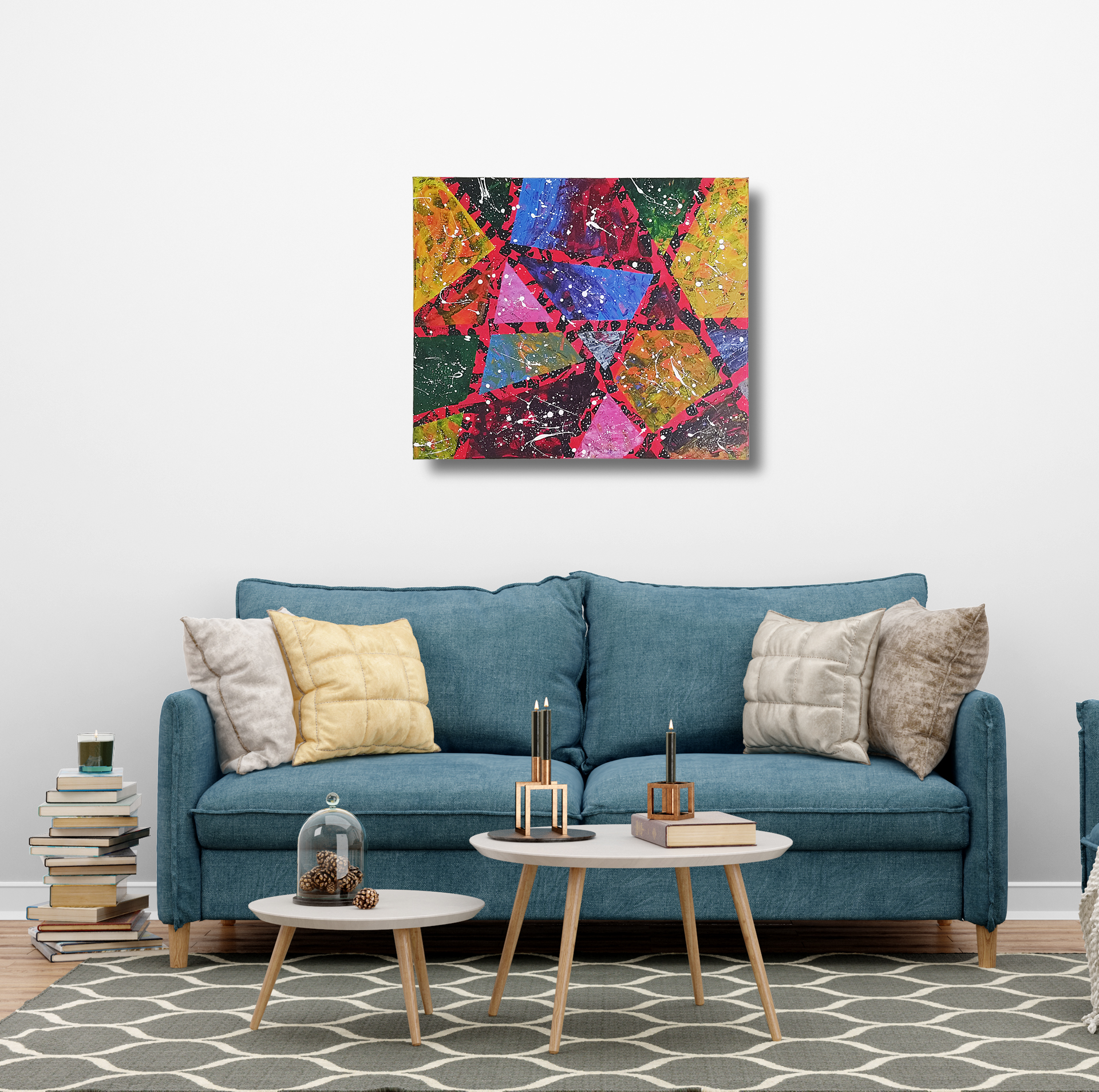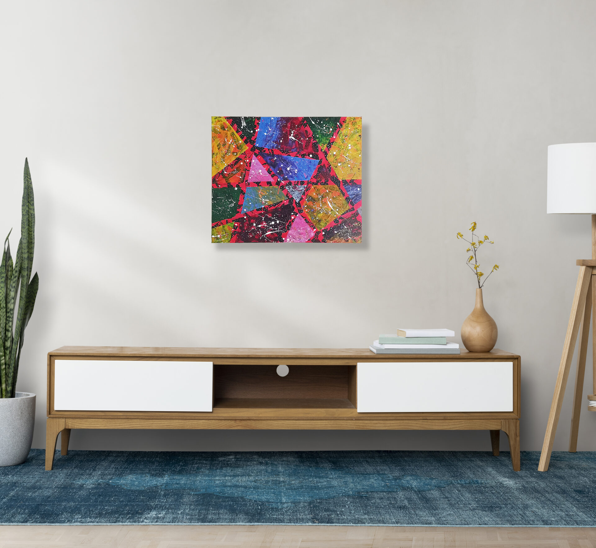 „Geometryczna Symfonia” to abstrakcyjne dzieło sztuki, które przyciąga uwagę widza za sprawą bogatych kolorów i geometrycznych kształtów.