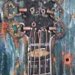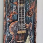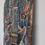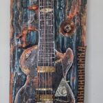 Zarys gitary wydłutowany ,elementy użyte :część specjalnie postarzona ,pokryta patyną,efekt rdzy.