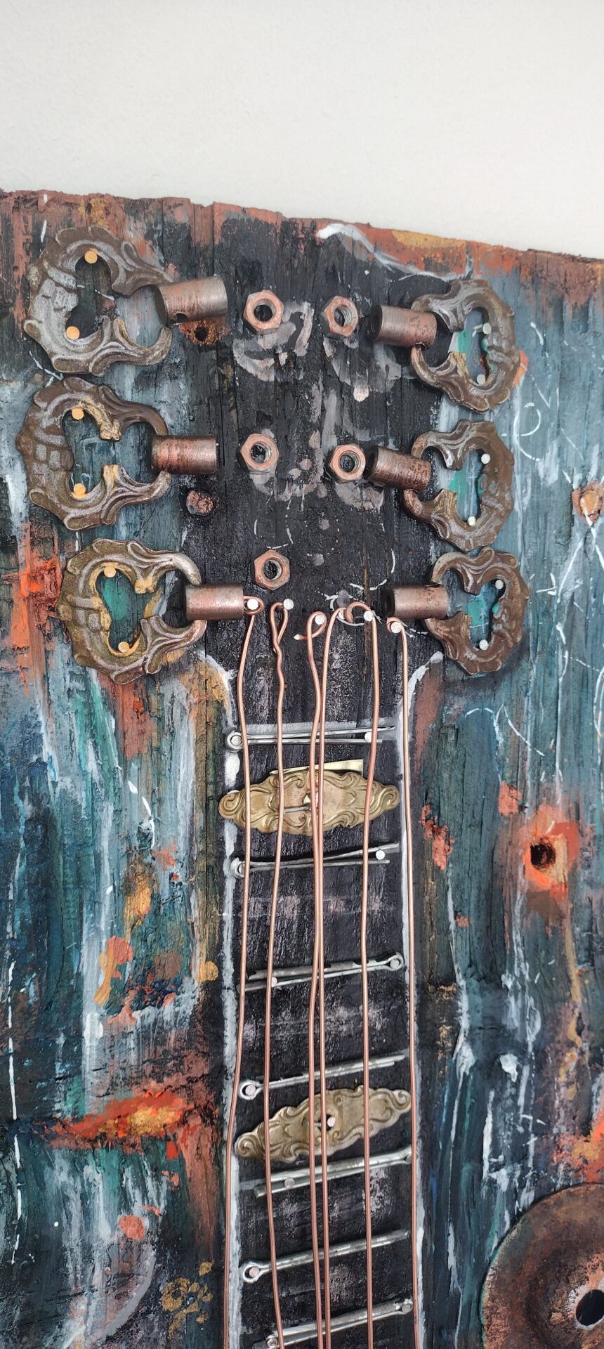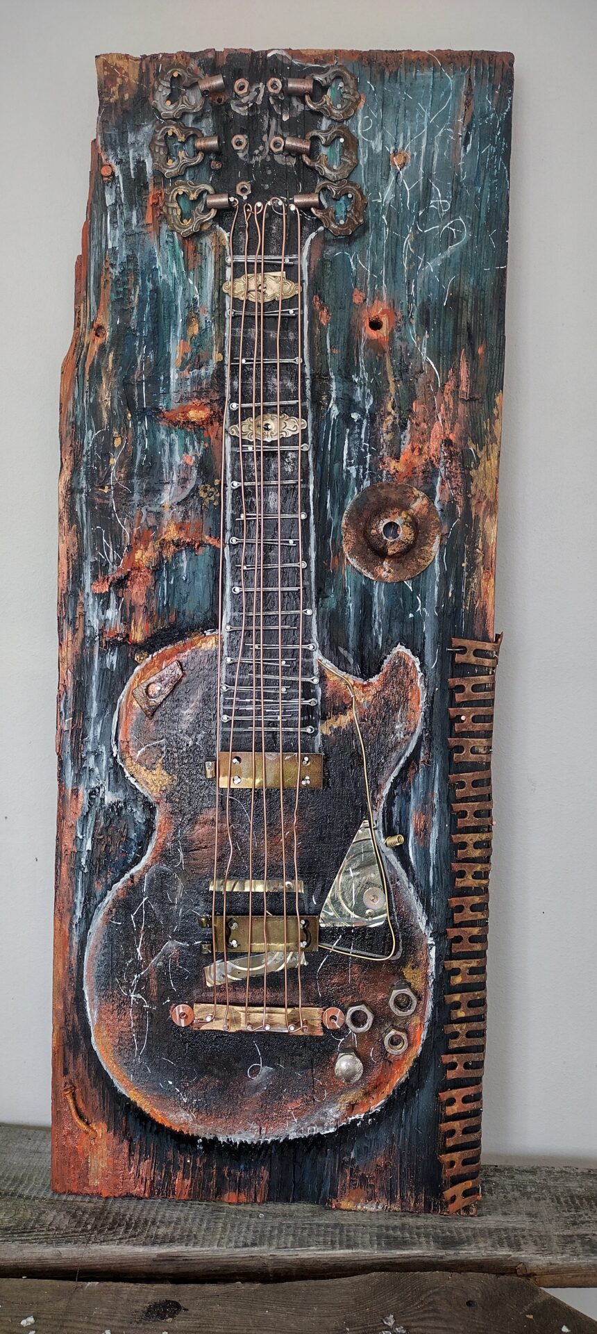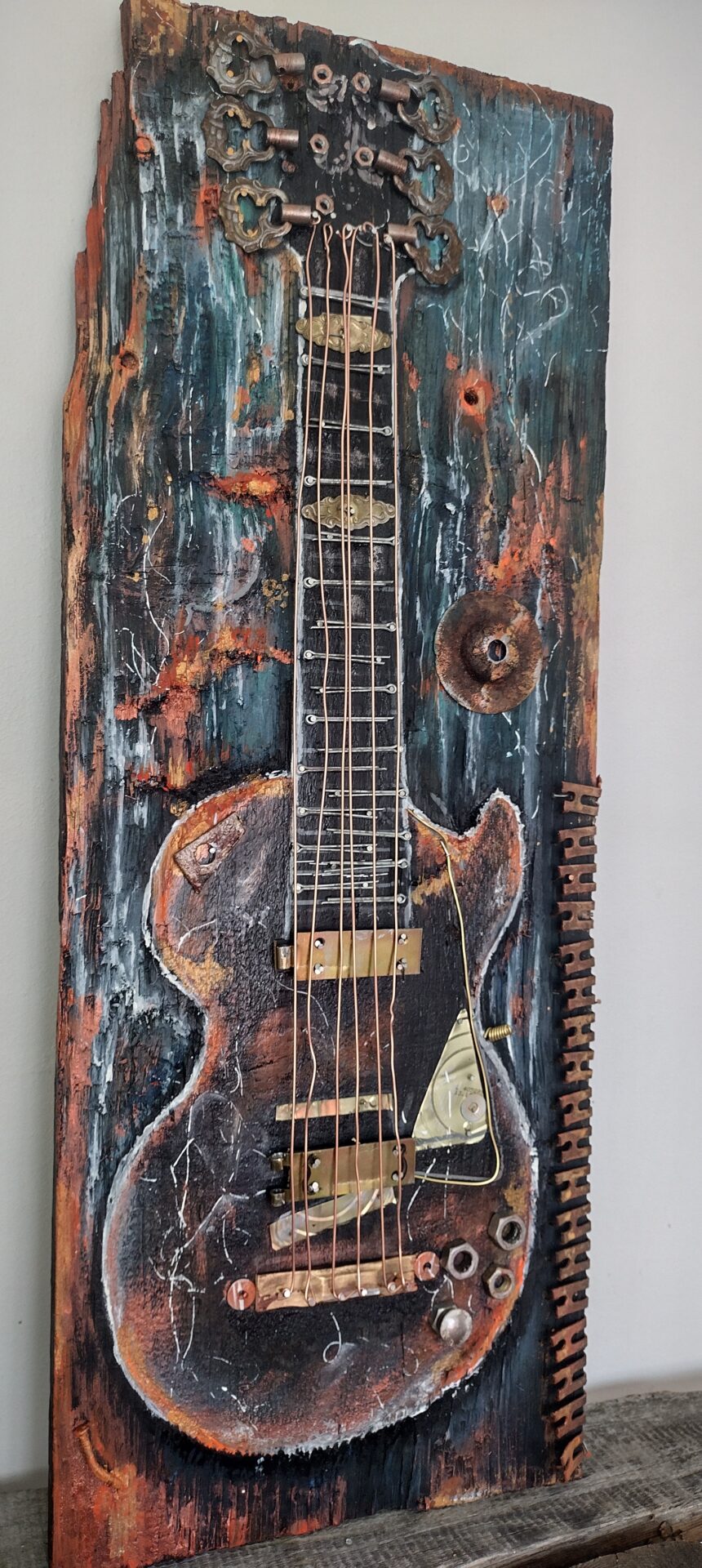 Zarys gitary wydłutowany ,elementy użyte :część specjalnie postarzona ,pokryta patyną,efekt rdzy.