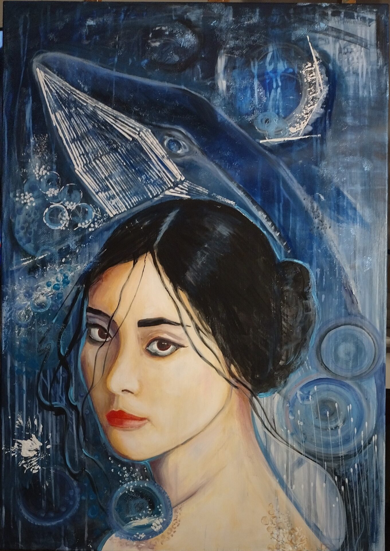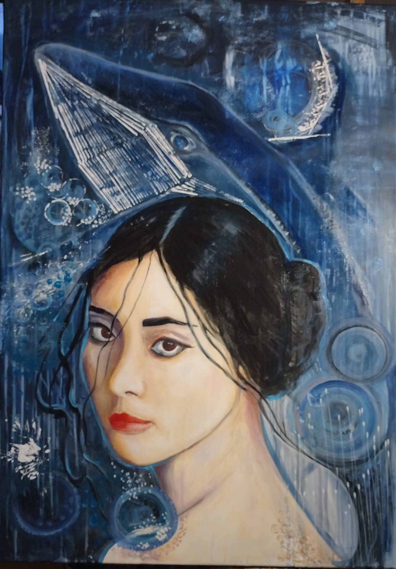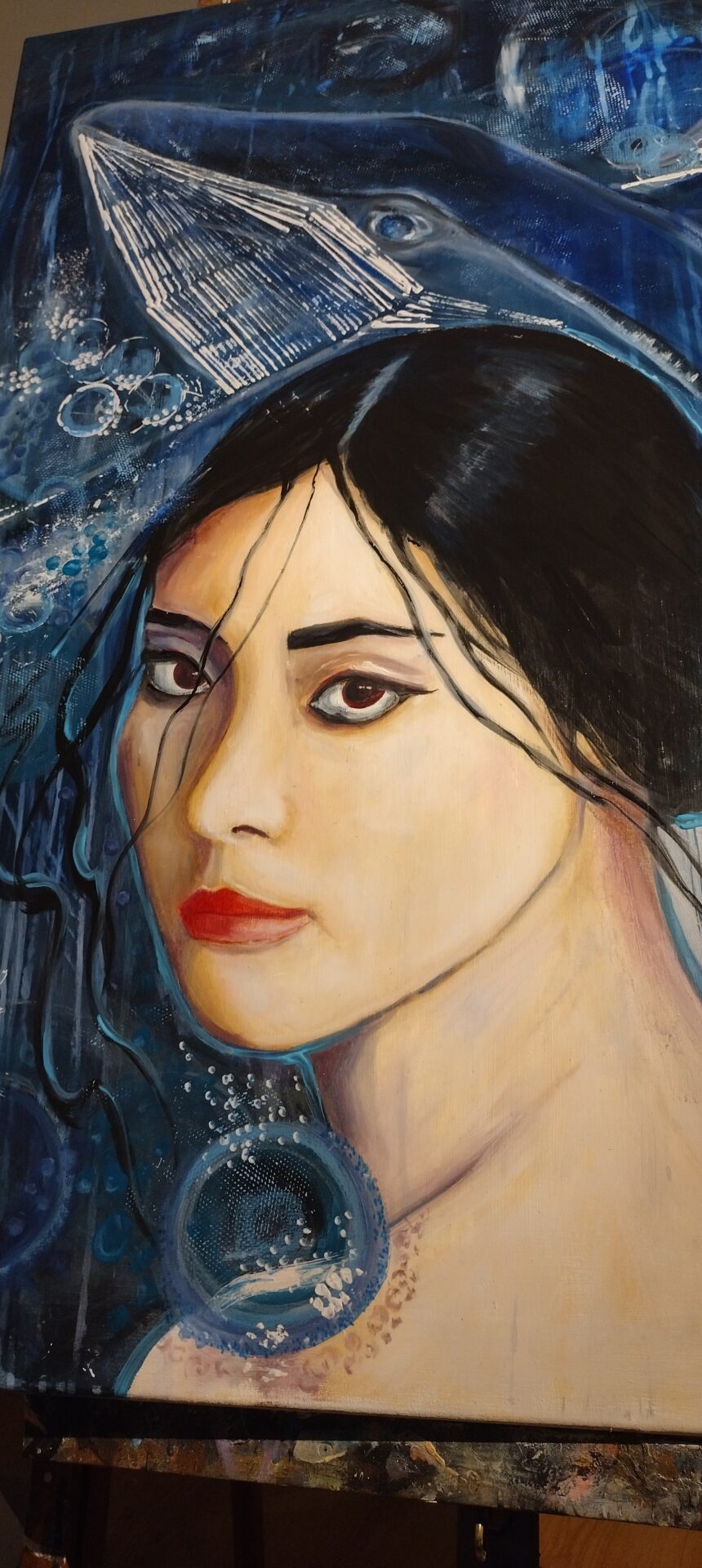 „Głębia spojrzenia ” to autorski,nowoczesny obraz olejny na płótnie .Rozmiar 100/70.Ocean jest pełen emocji ,jest głębią.Można na niego patrzeć naszymi oczami lub oczami Istot zamieszkujących w tym środowisku ..