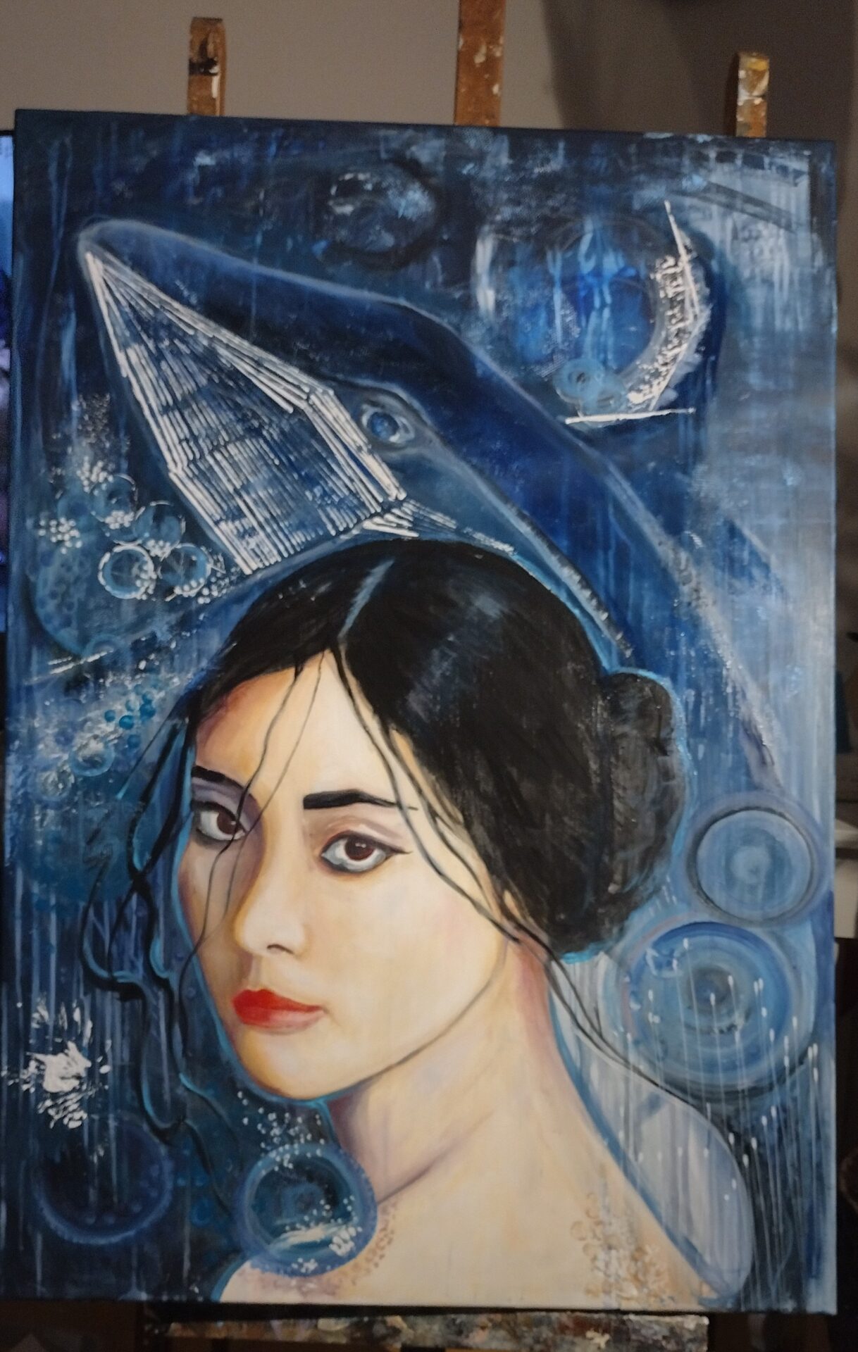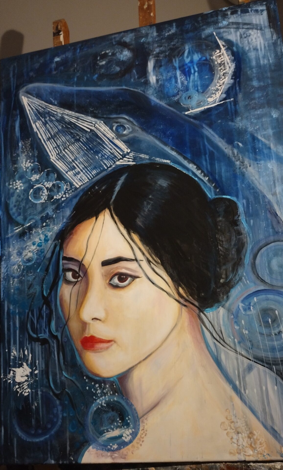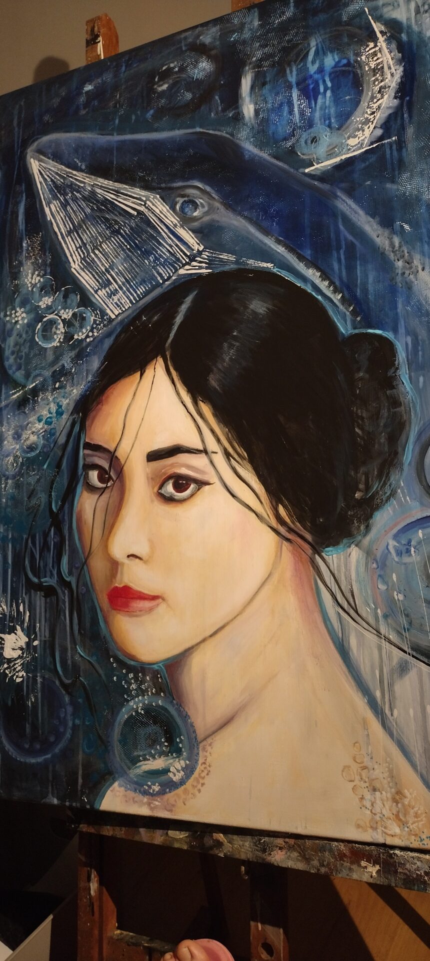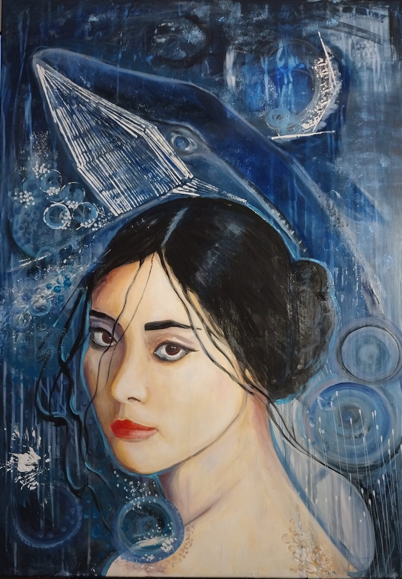 „Głębia spojrzenia ” to autorski,nowoczesny obraz olejny na płótnie .Rozmiar 100/70.Ocean jest pełen emocji ,jest głębią.Można na niego patrzeć naszymi oczami lub oczami Istot zamieszkujących w tym środowisku ..