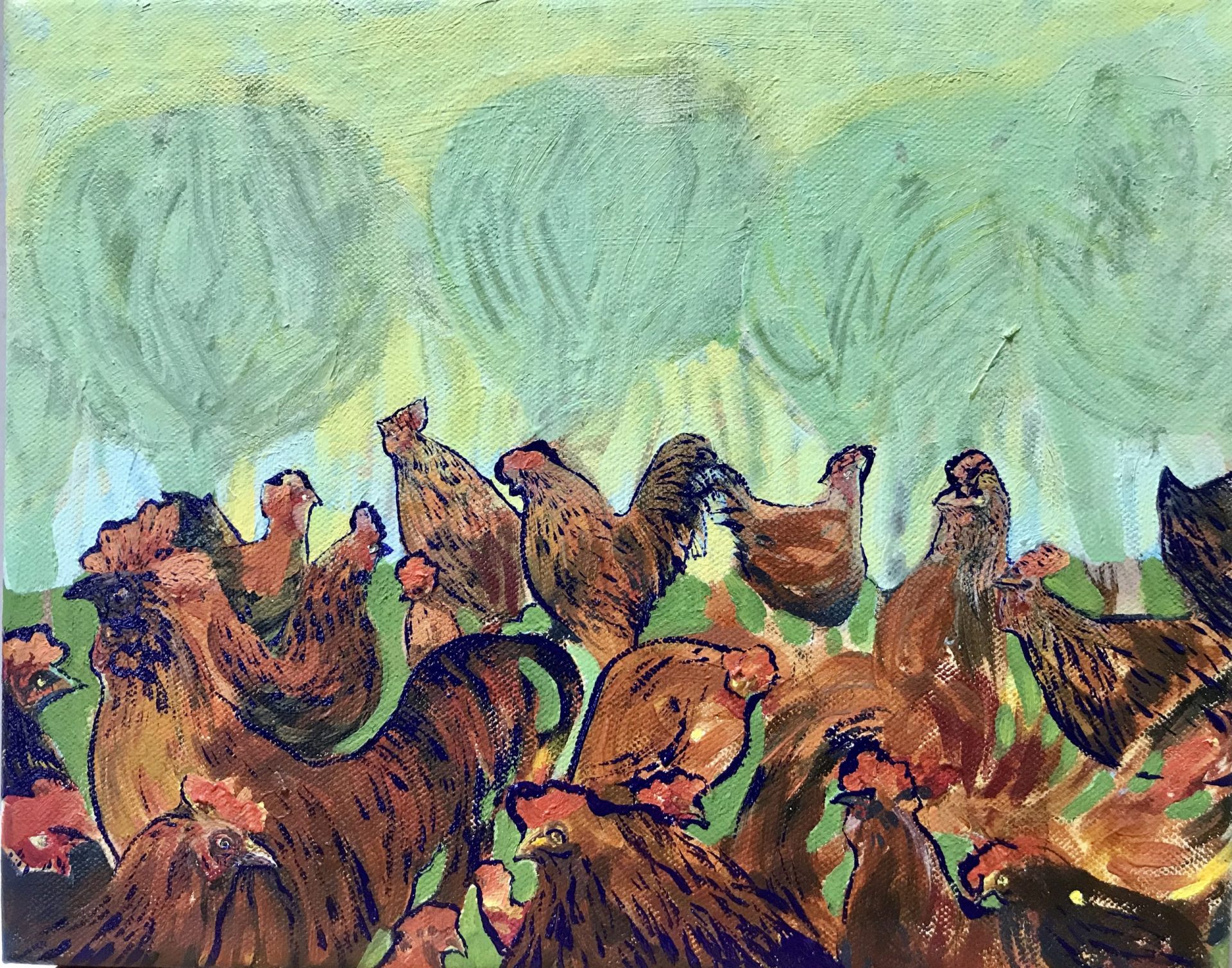 Wymiary: 24 x 29 cm, technika olejna, obraz sygnowany. Tytuł „ Głośny pejzaż z kogutem”.