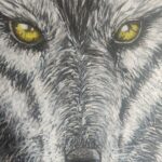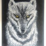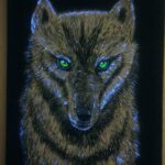 Sprzedam obraz przedstawiający głowę białego wilka, tło czarne, boki obrazu zamalowane. W obrazie użyłem fluorescencyjnej farby, dzieki czemu w ciemności, oczy oraz kontury wilka świecą, sprawiając wrażenie jakby wilk nas obserwował. Obraz w tym celu musi być zawieszony pod źródłem światła lub w naslonecznionym miejscu.