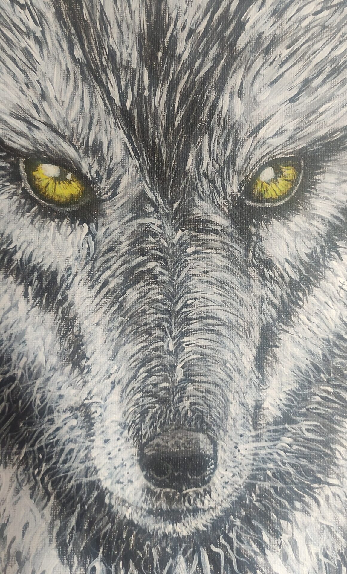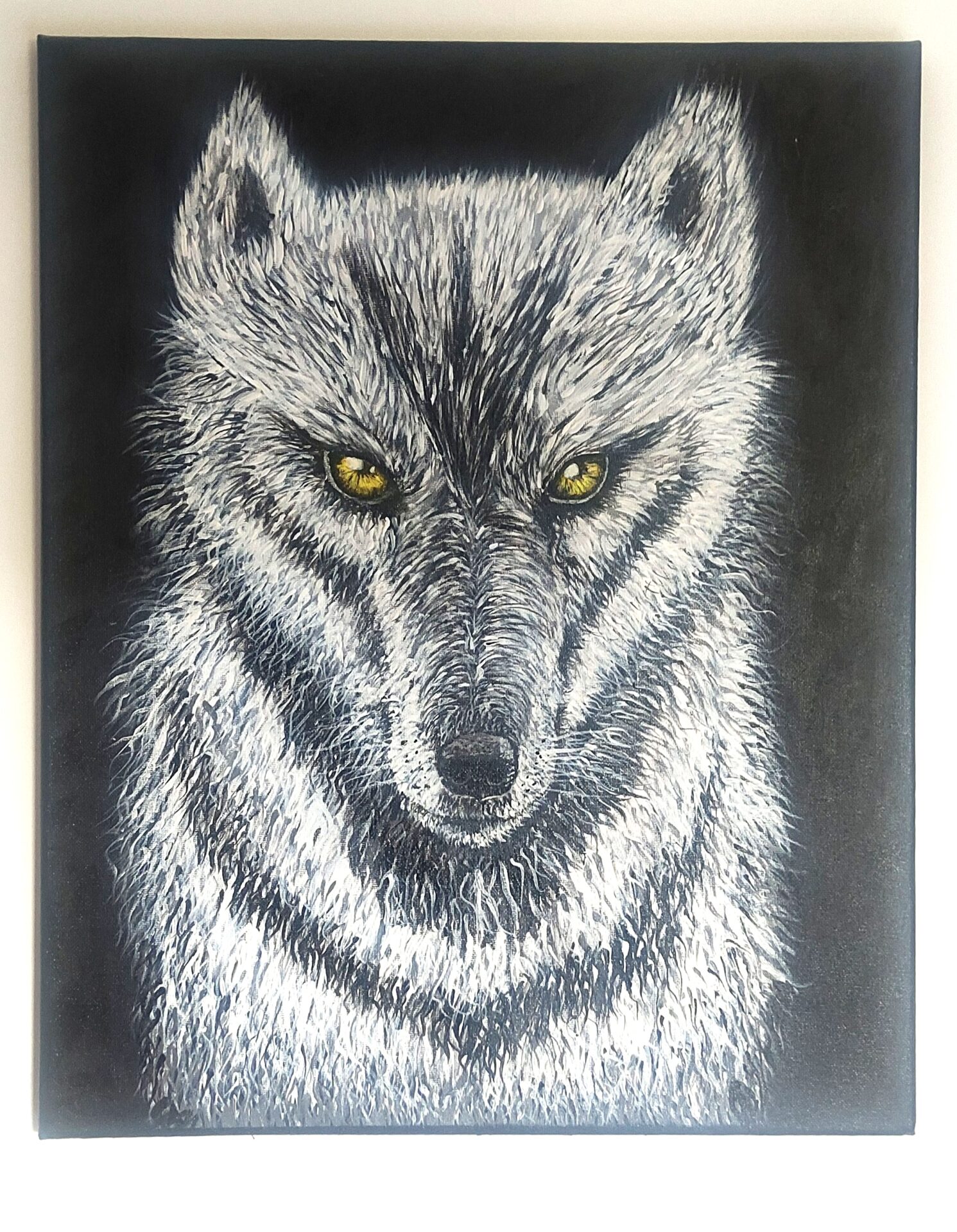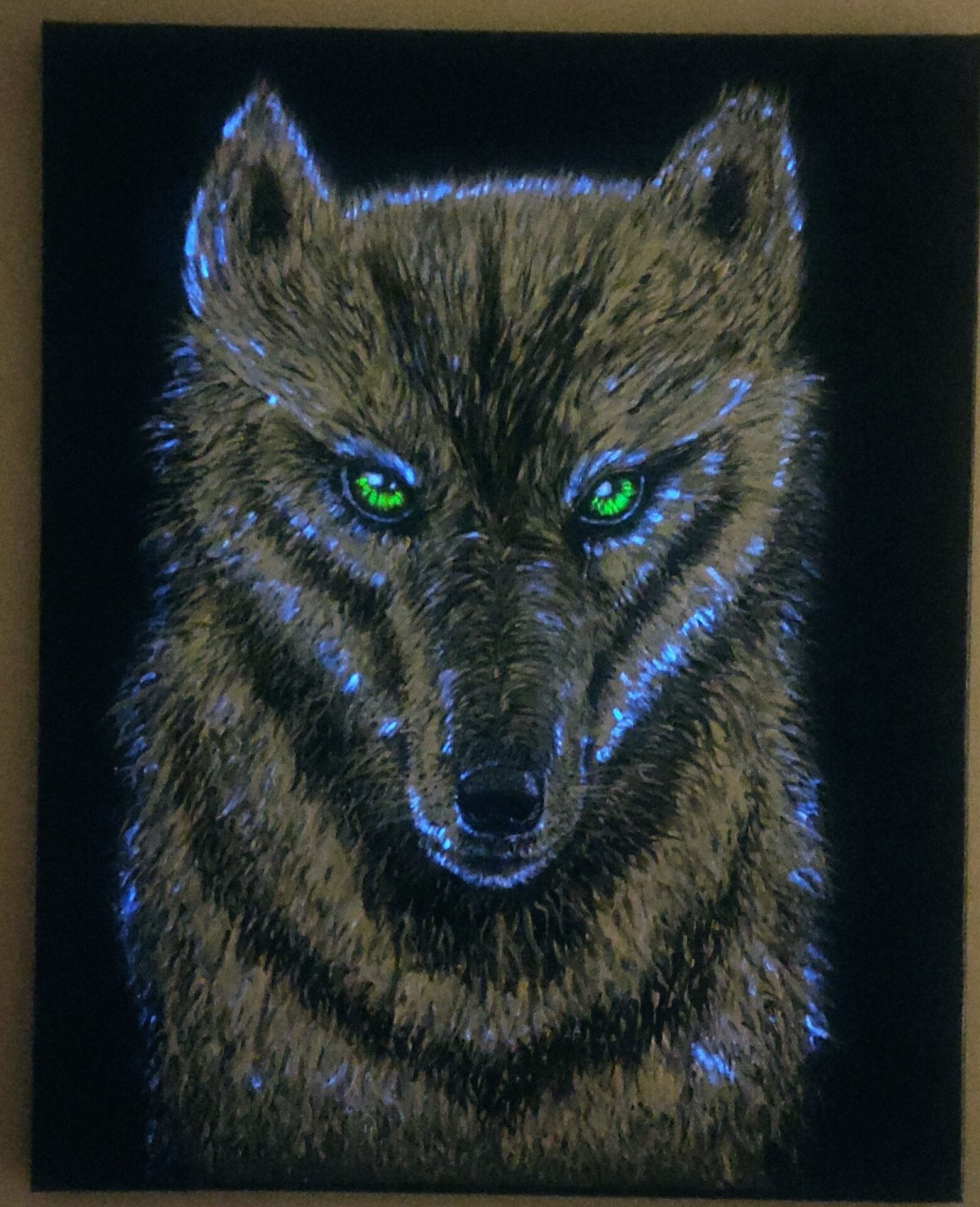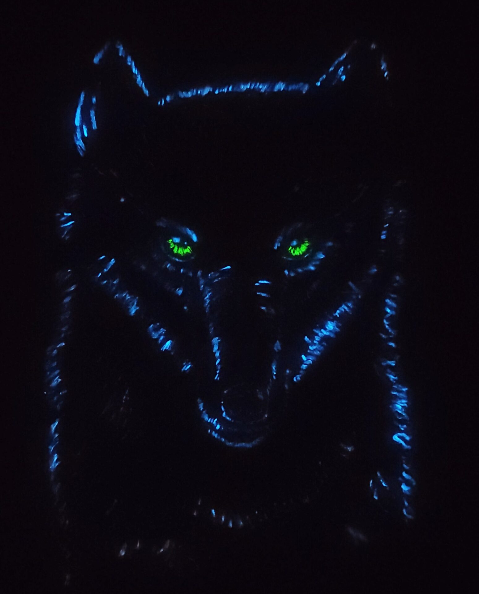 Sprzedam obraz przedstawiający głowę białego wilka, tło czarne, boki obrazu zamalowane. W obrazie użyłem fluorescencyjnej farby, dzieki czemu w ciemności, oczy oraz kontury wilka świecą, sprawiając wrażenie jakby wilk nas obserwował. Obraz w tym celu musi być zawieszony pod źródłem światła lub w naslonecznionym miejscu.
