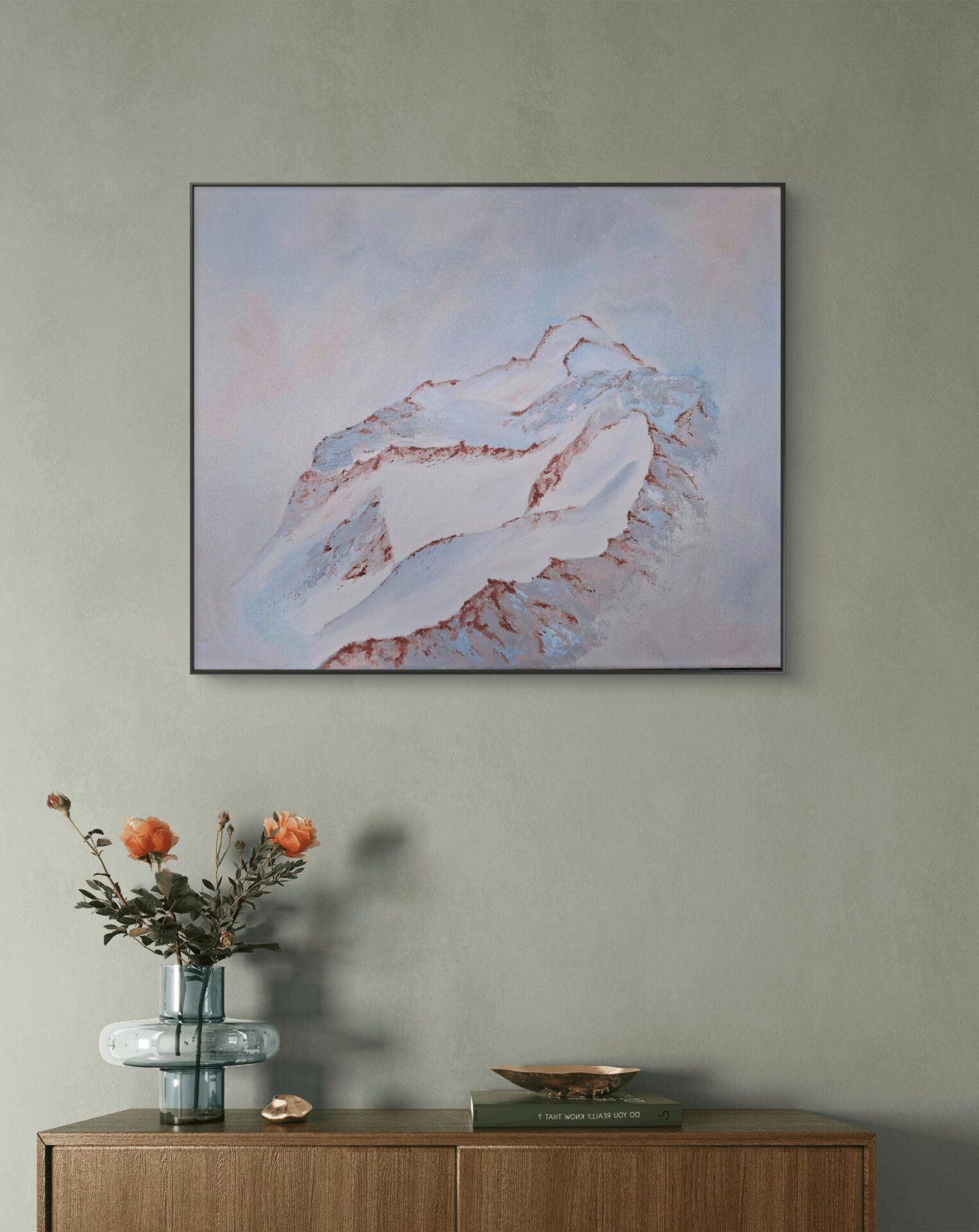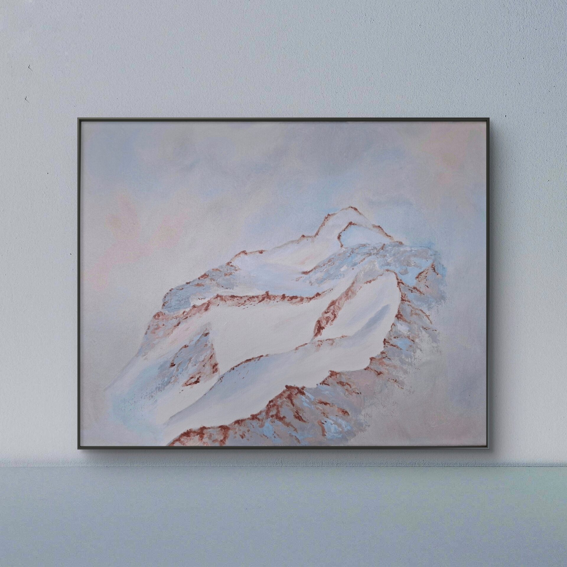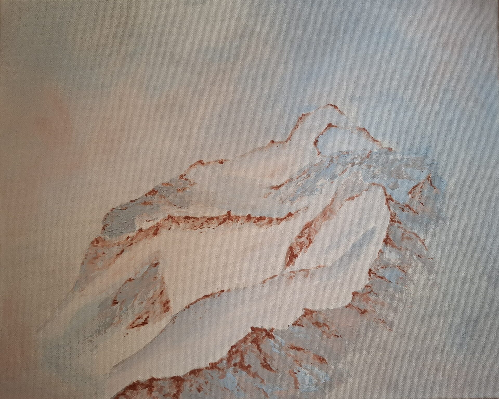 Góry namalowane we mgle w pastelowych kolorach. Płótno o wymiarach 30×40 cm. Farby akrylowe.