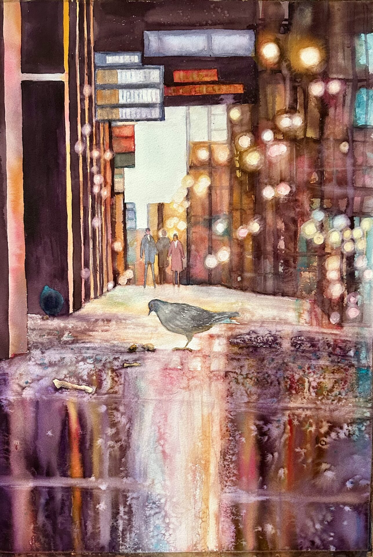 Nastrojowa, duża akwarela o wymiarach 40×60 cm, w oprawie 50×70 cm.
