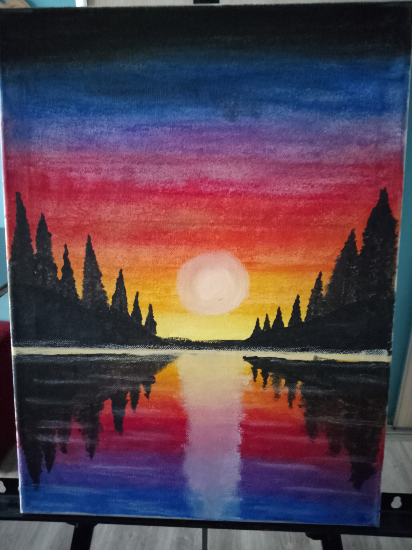Obraz pokazuje zachód słońca w górach. Obraz został wykonany za pomocą pasteli suchych i farb. Tworzony był 5 godzin. Wymiary obrazu: szerokość 30cm i wysokość 40cm