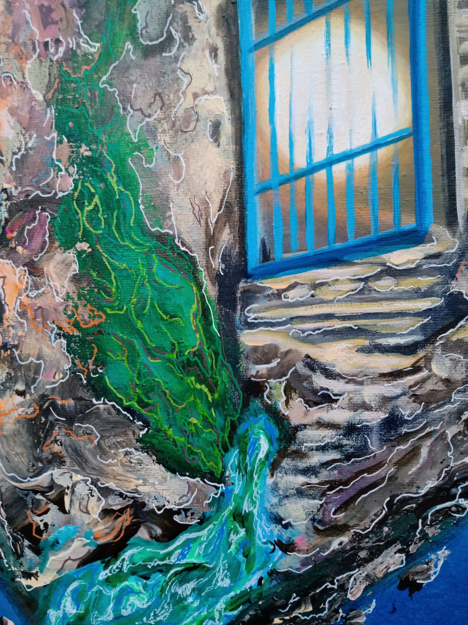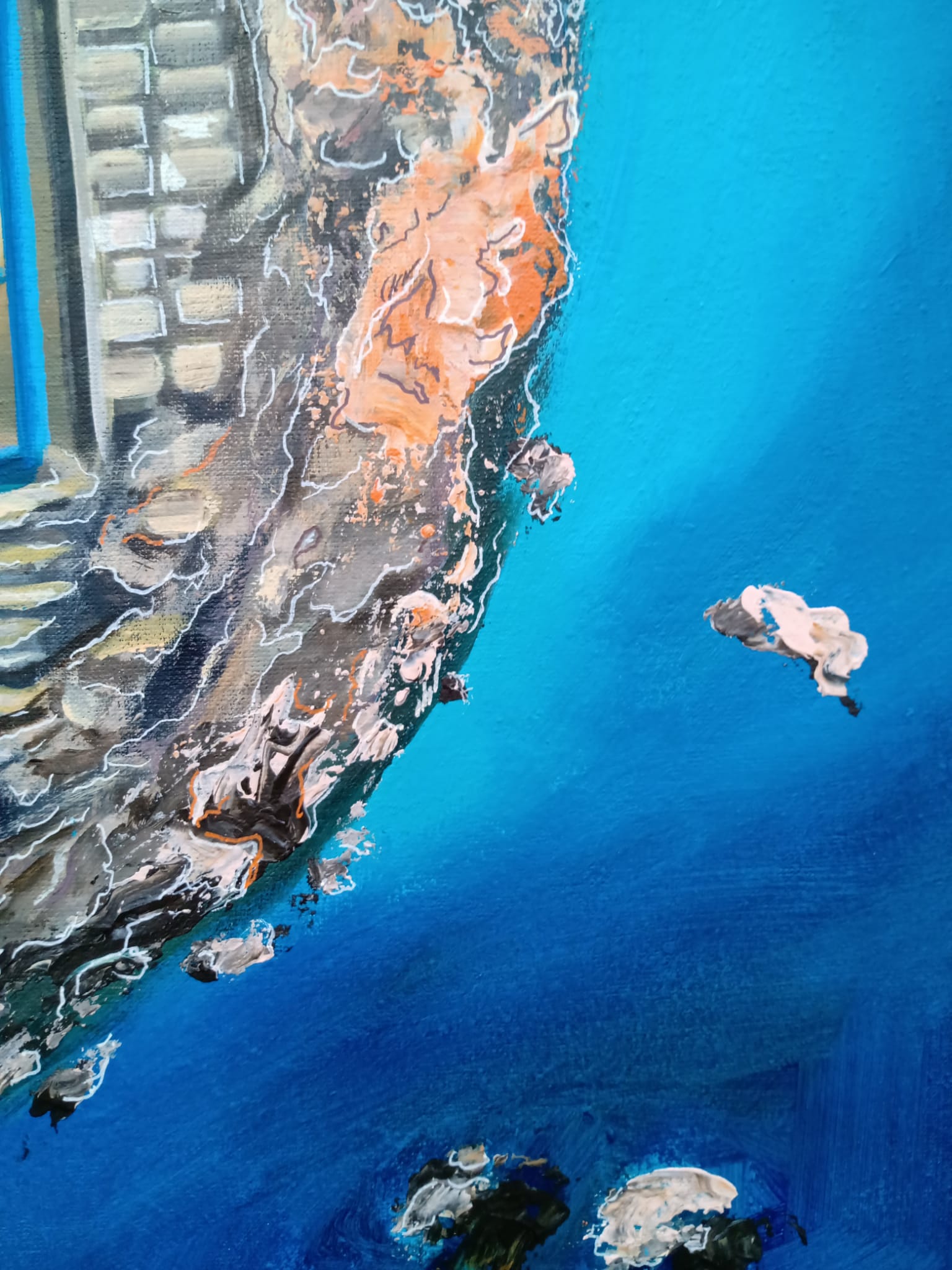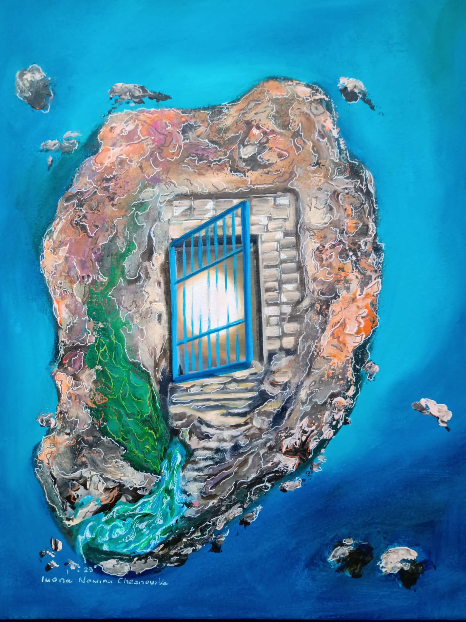 Unikalny, autorski, wg własnego pomysłu obraz zainspirowany moim niedawnym pobytem na Malcie. Jednak to pobliska wyspa Gozo podbiła moje serce. Spokojna i tajemnicza. Gozańczycy uważają ją za wyspę szczęścia. Tam właśnie urzekło mnie zejście do błękitnej groty przez błękitną furtkę. Furtka jest prawdziwa, reszta to moja wizja tej wyspy. Obraz namalowałam na płótnie 40 x 50 cm farbami akrylowymi, pędzlami i szpachelkami, stąd nierówności powierzchni obrazu. Malowałam z przerwami około 2 tygodnie, w chwilach natchnienia coś dodając lub zmieniając. Teraz uważam, że o taki obraz mi chodziło.