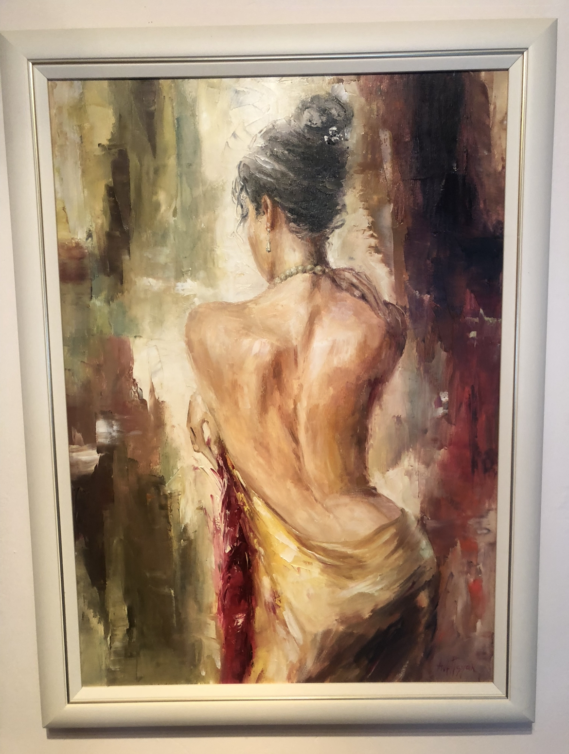 Na tym obrazie olejnym ukazana jest elegancka postać kobiety w sukience z odkrytymi plecami, co nadaje scenie nutę subtelnej gracji. Jej związane włosy i delikatne kolczyki dodają kompozycji wyrafinowania. Odwrócona tyłem, kobieta prezentuje się z wdziękiem, a jasne kolory i łagodne oświetlenie tworzą atmosferę spokoju i harmonii. Całość oddaje wrażenie intymności i delikatności. Jeśli interesuje Cię więcej informacji o tym dziele, uprzejmie proszę o wysłanie SMS.