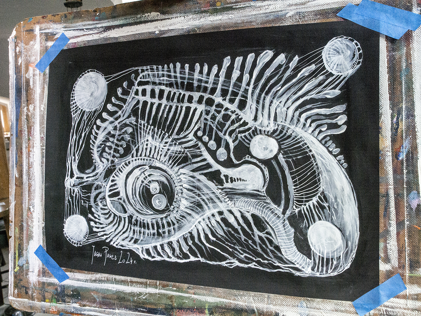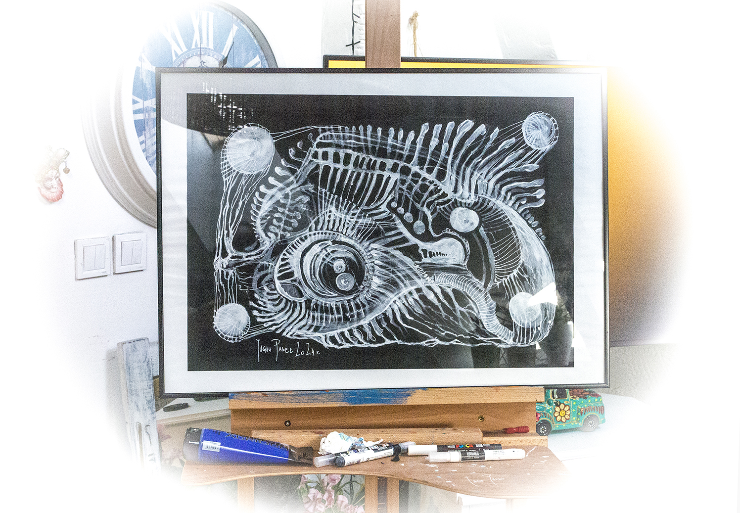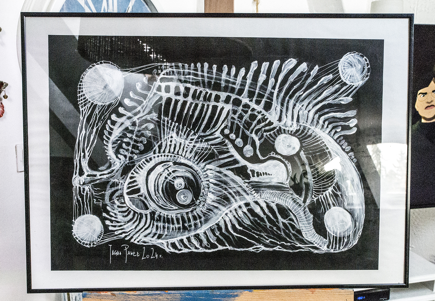 Praca autorska akryl na papierze czarnym w ramie aluminiowej pod szkłem 50×70 Akryl